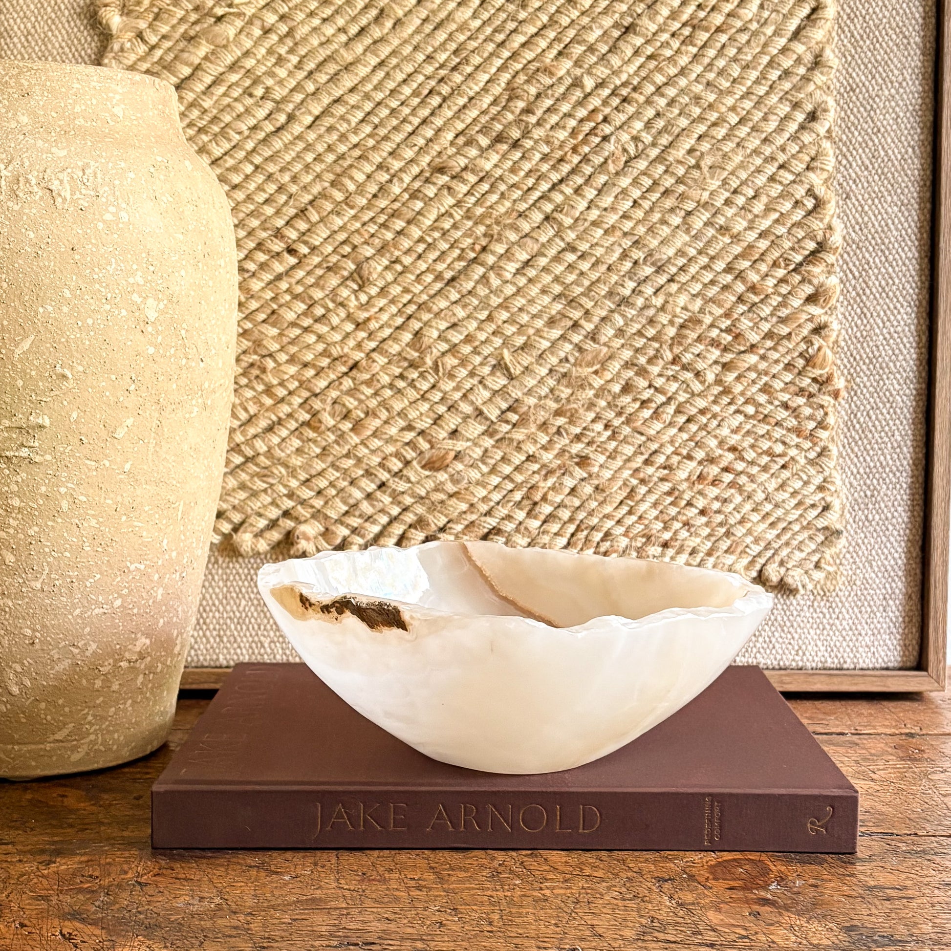 Amber onyx is prized for its soothing color and luminous translucence. Formed over centuries, this stone carries the quiet drama of nature’s artistry—now shaped into a functional accent for your table, shelf, or entryway. Whether styled alone or layered into a curated vignette, this bowl adds instant warmth and sophistication.