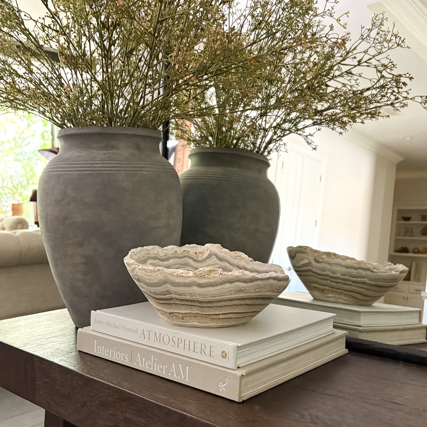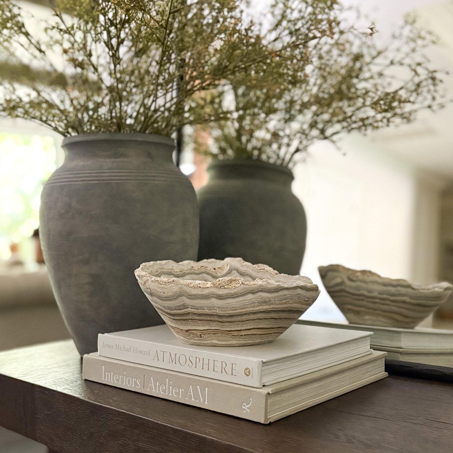 Indulge in the luxurious charm of our Hand Carved Grey Onyx Bowl. This exquisite bowl was carefully crafted by hand, showcasing the intricate banded patterning of the stone. Perfect for display on a table or bookshelf, this bowl adds a touch of sophistication and elegance to any space. Elevate your home decor with this timeless piece.