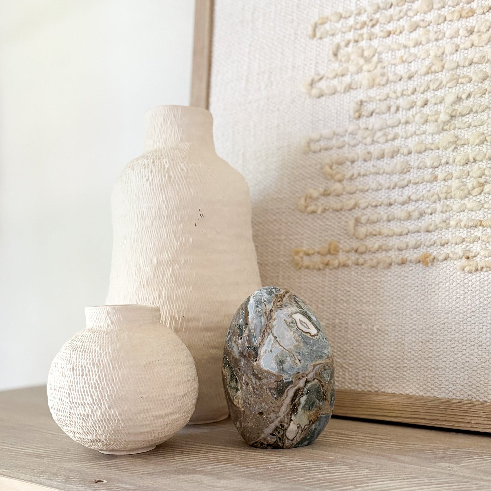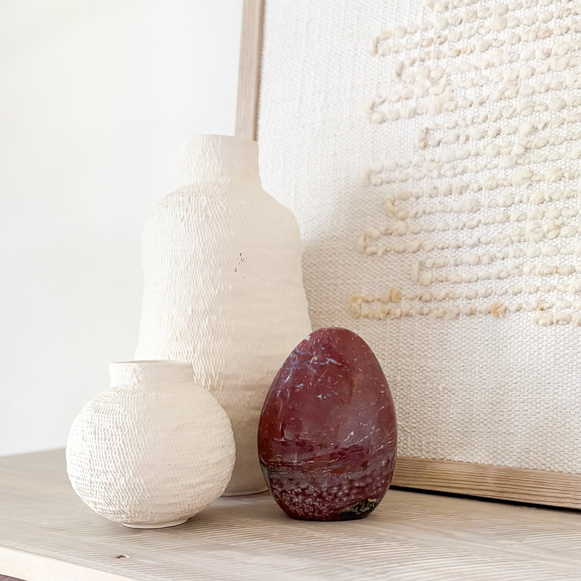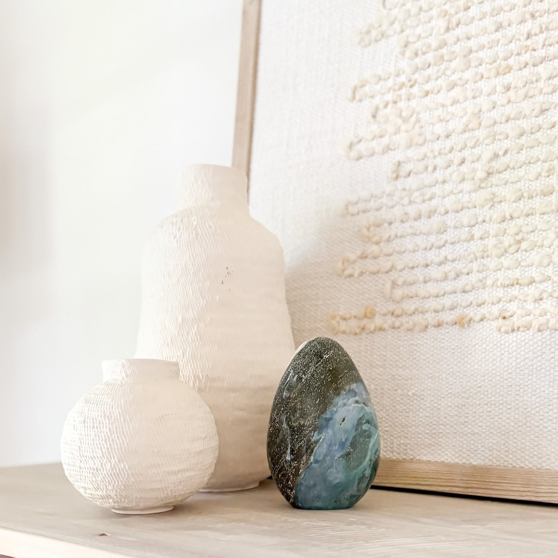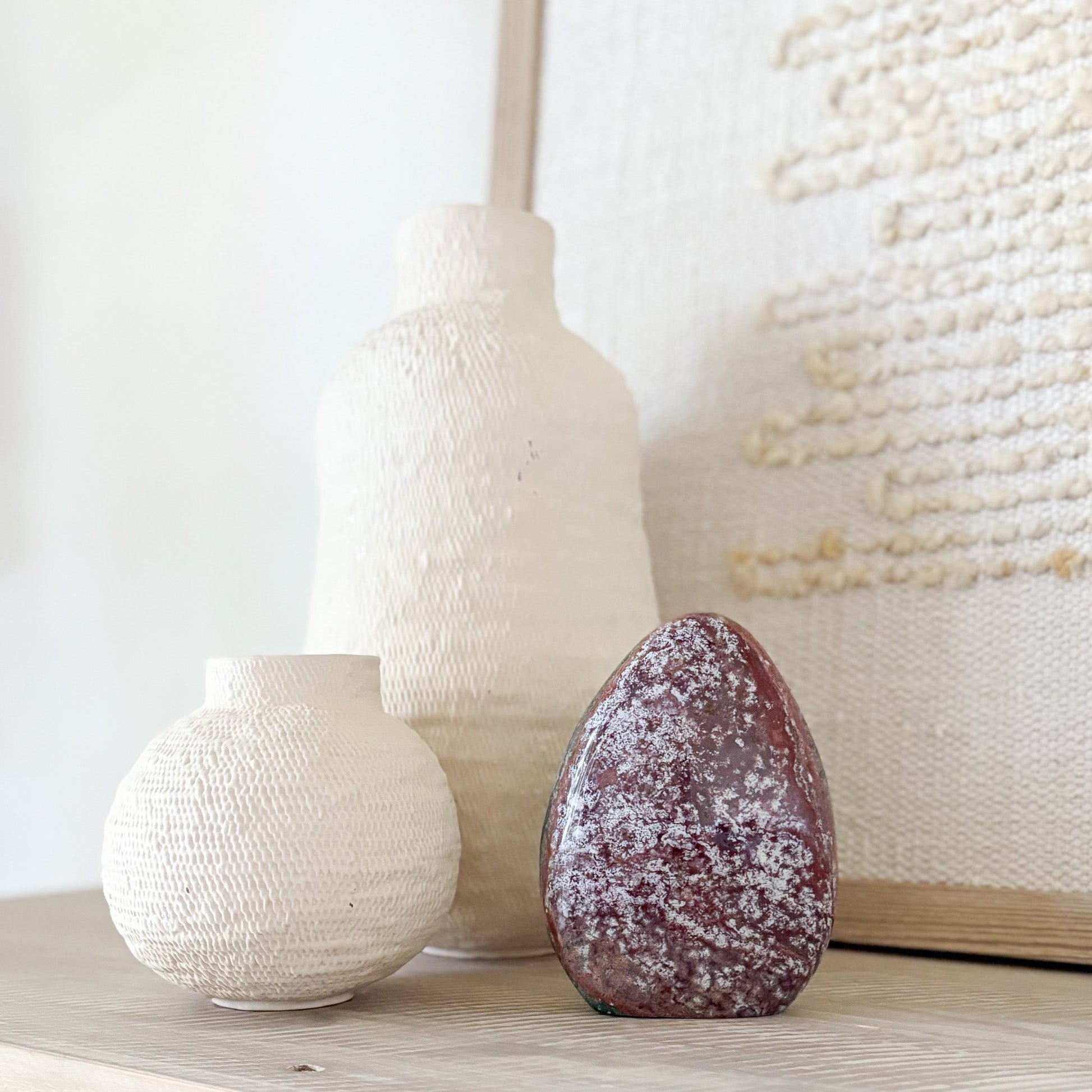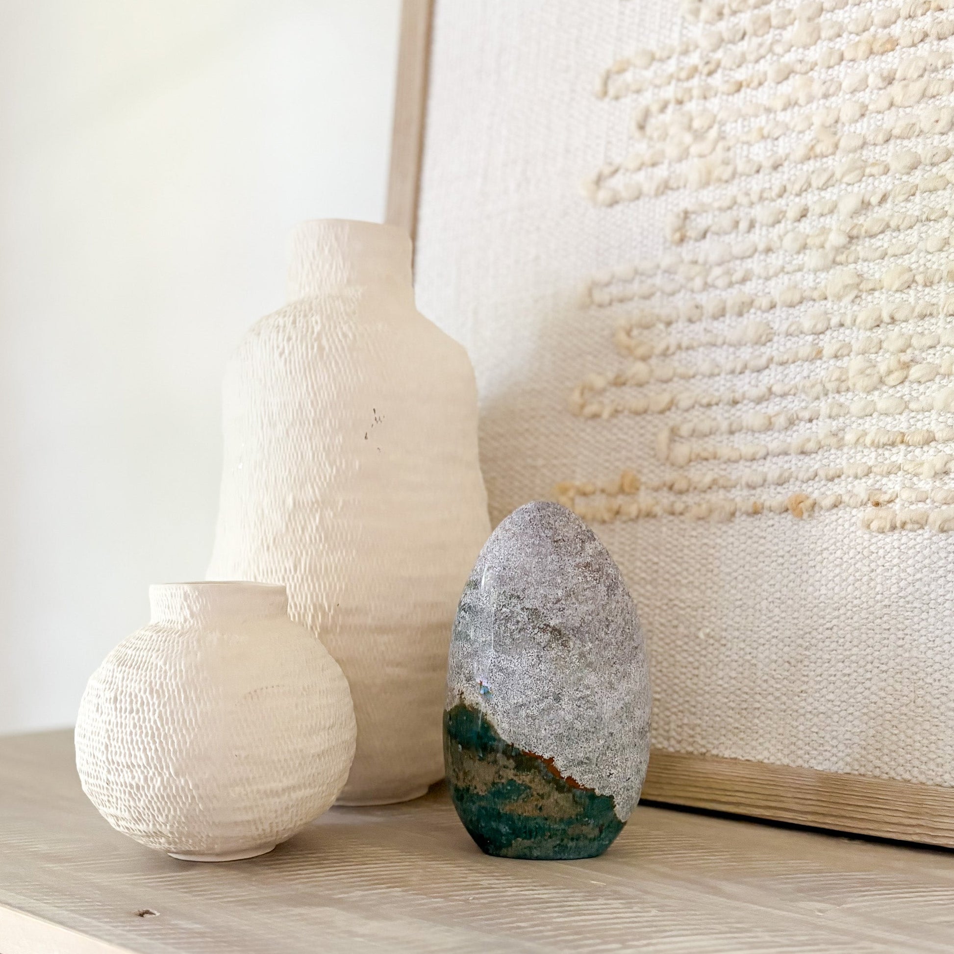 Each piece features oceanic hues and orbicular patterns that evoke coastal tranquility. Known as the “Stone of Joy,” Ocean Jasper promotes emotional healing, relaxation, and inner peace. Polished to a glossy finish, it’s a stunning focal point for any space—natural art with a serene presence.