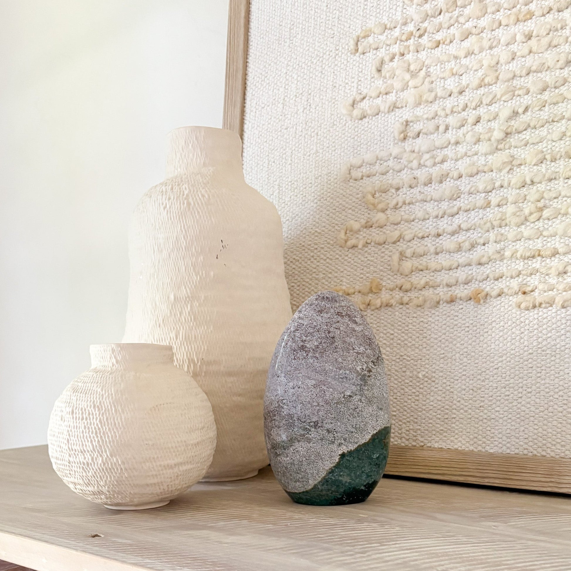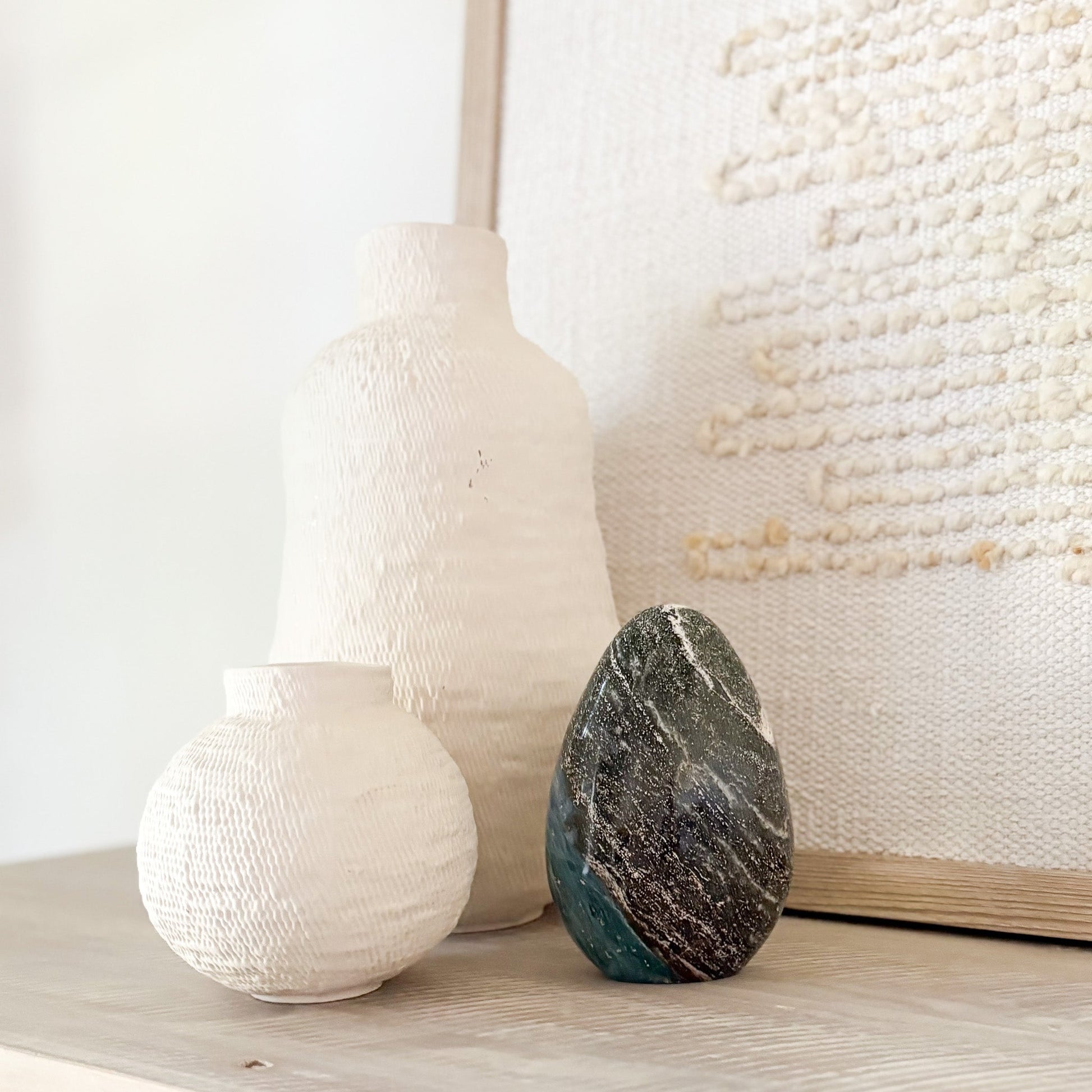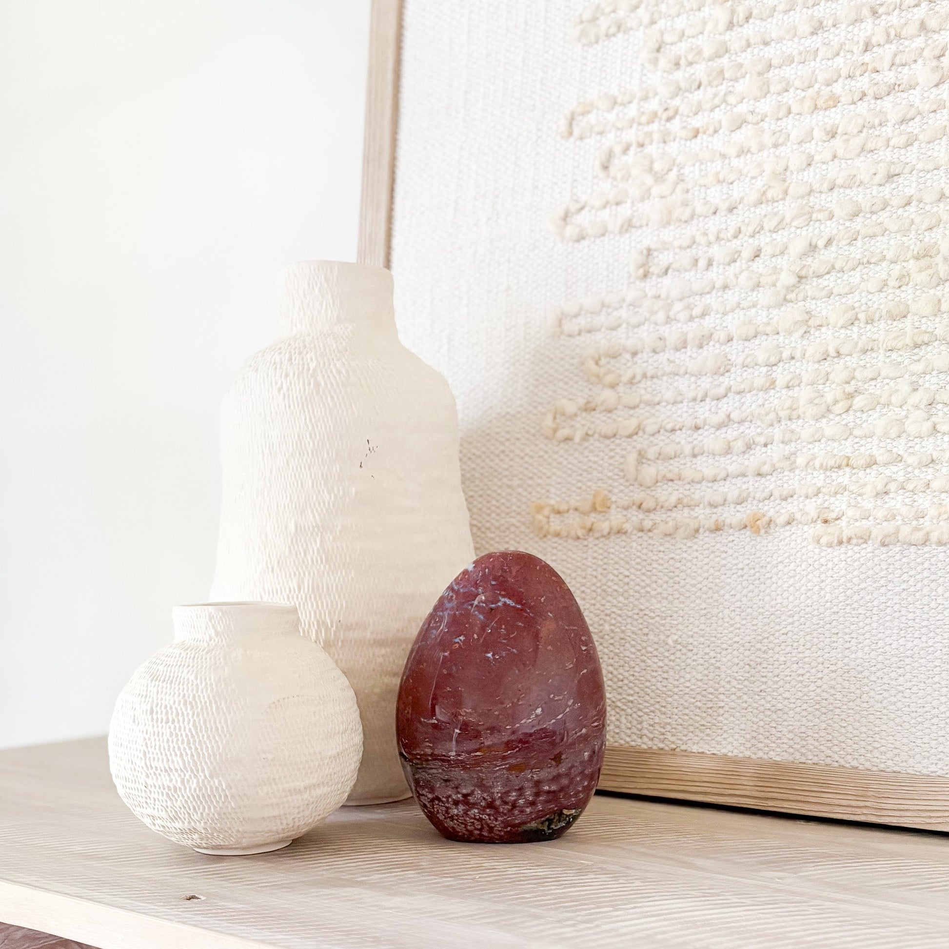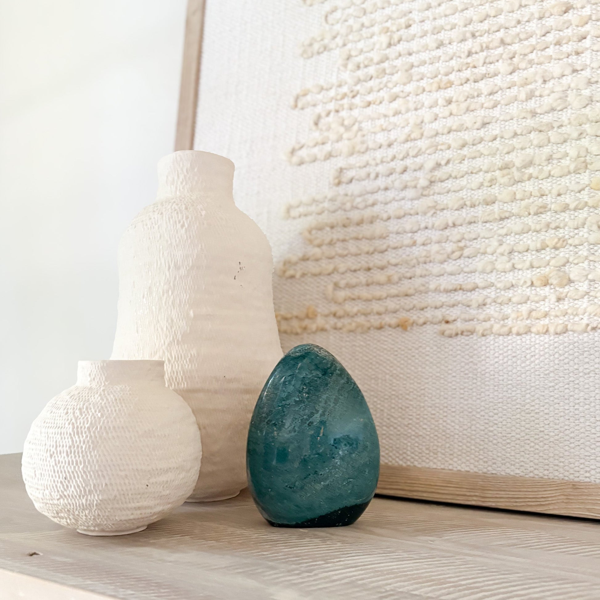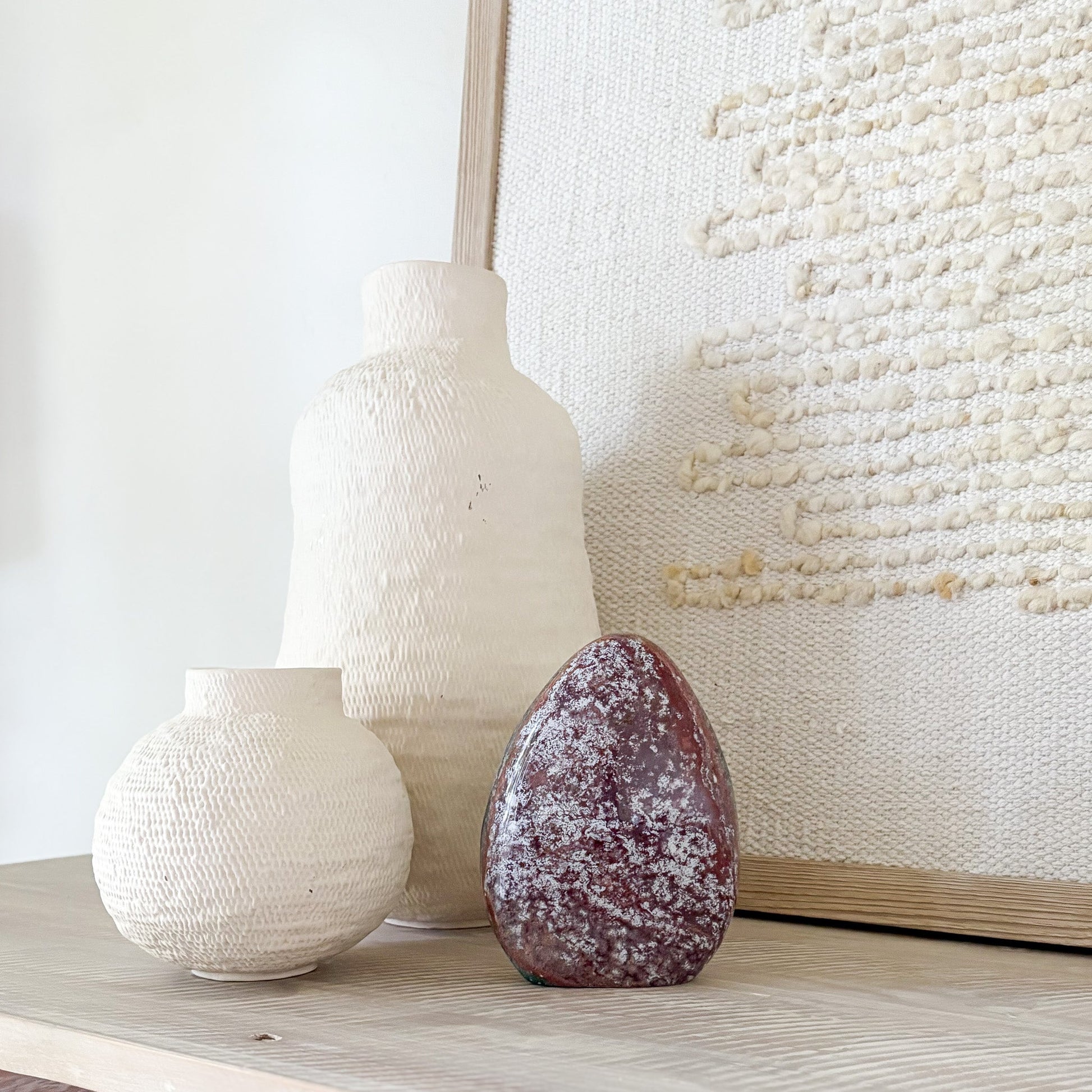 Each piece features oceanic hues and orbicular patterns that evoke coastal tranquility. Known as the “Stone of Joy,” Ocean Jasper promotes emotional healing, relaxation, and inner peace. Polished to a glossy finish, it’s a stunning focal point for any space—natural art with a serene presence.