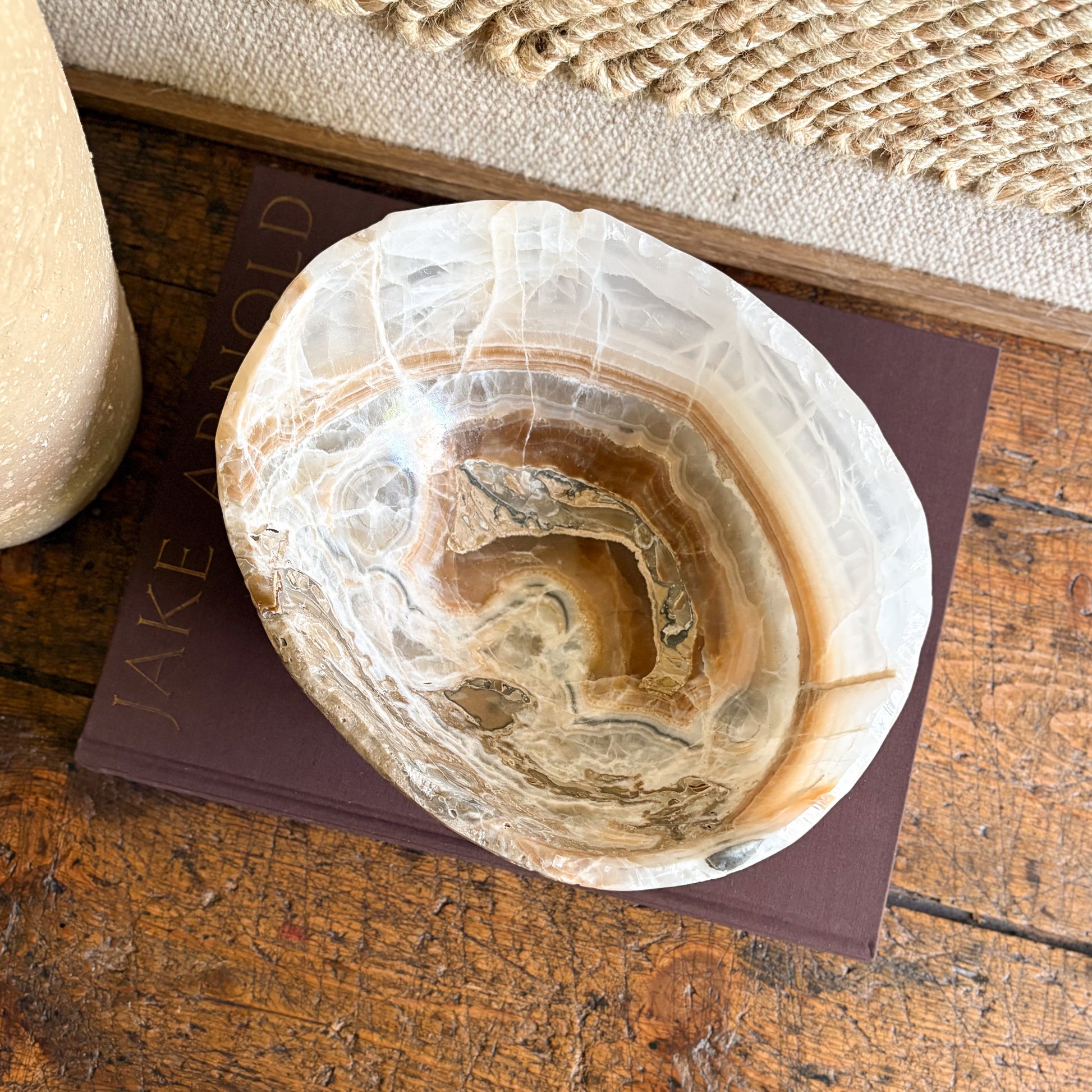 Amber onyx is prized for its soothing color and luminous translucence. Formed over centuries, this stone carries the quiet drama of nature’s artistry—now shaped into a functional accent for your table, shelf, or entryway. Whether styled alone or layered into a curated vignette, this bowl adds instant warmth and sophistication.