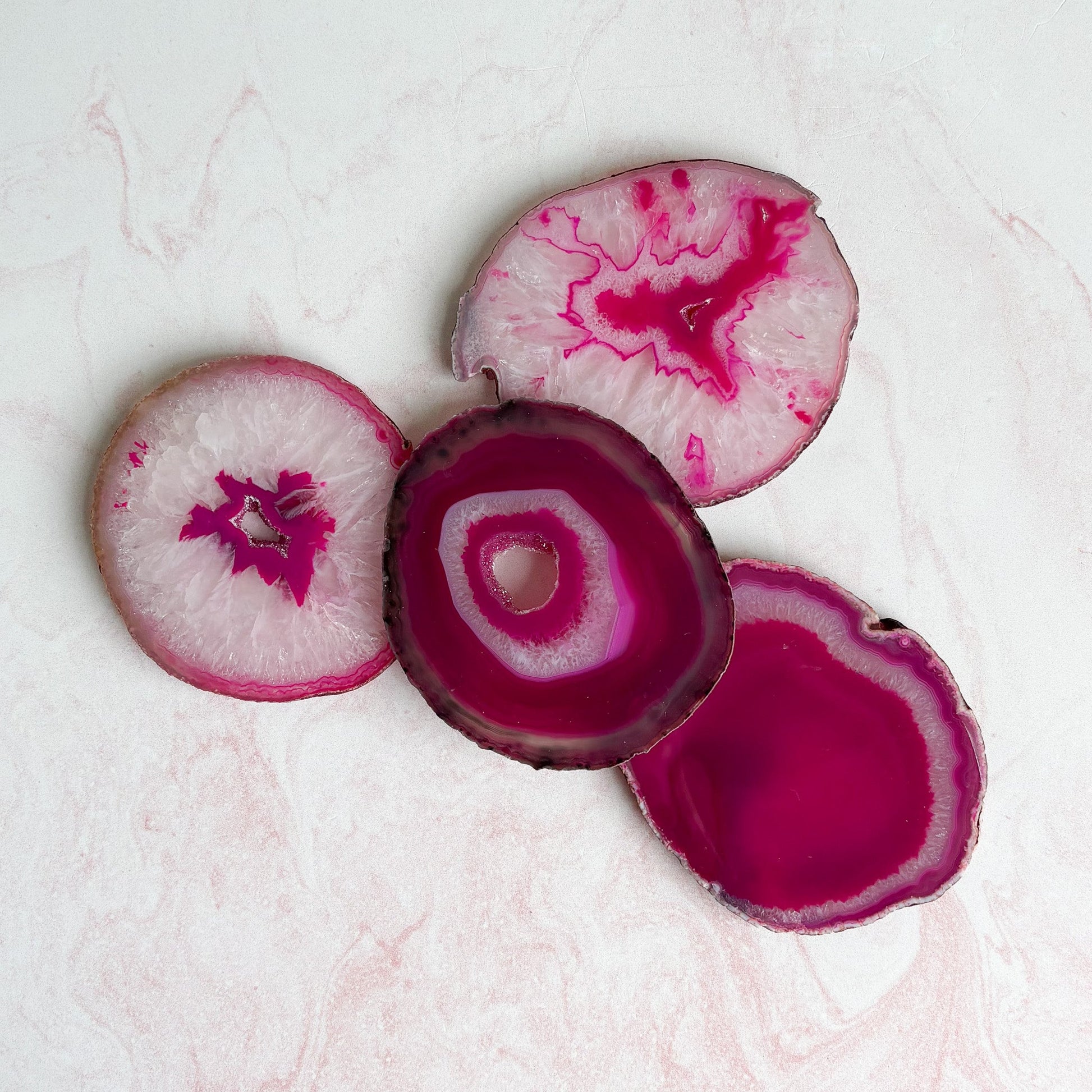 Add a pop of color to your space with our Vibrant Fuchsia Agate Coaster Set!