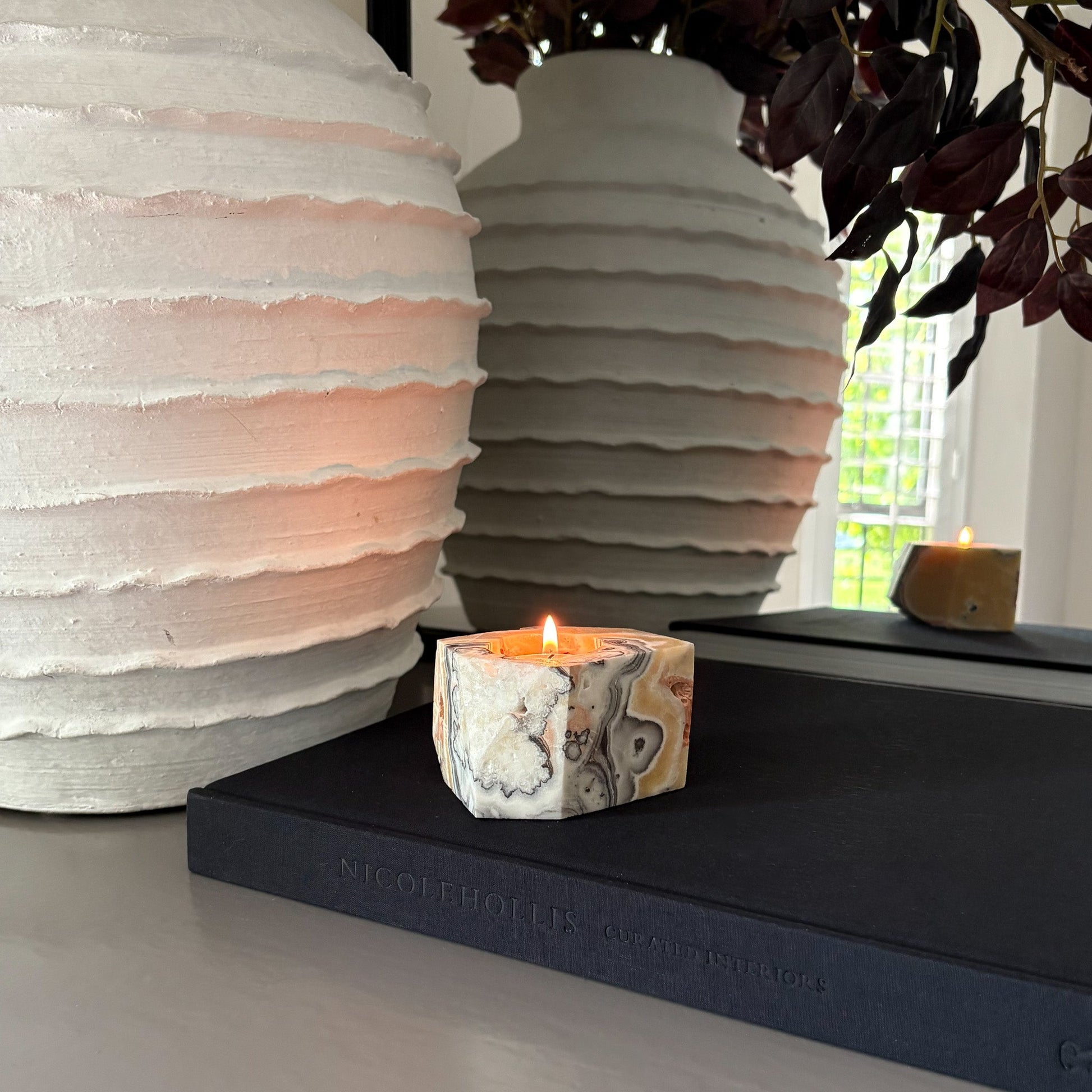 Infuse your home with the grounding beauty of nature. Our Faceted Zebra Calcite Tealight Candle Holder is a striking fusion of natural artistry and ambient light. Carved from genuine Zebra Calcite, each piece features dramatic bands of cream, brown, and grey—each one unique, just like the rock it came from.