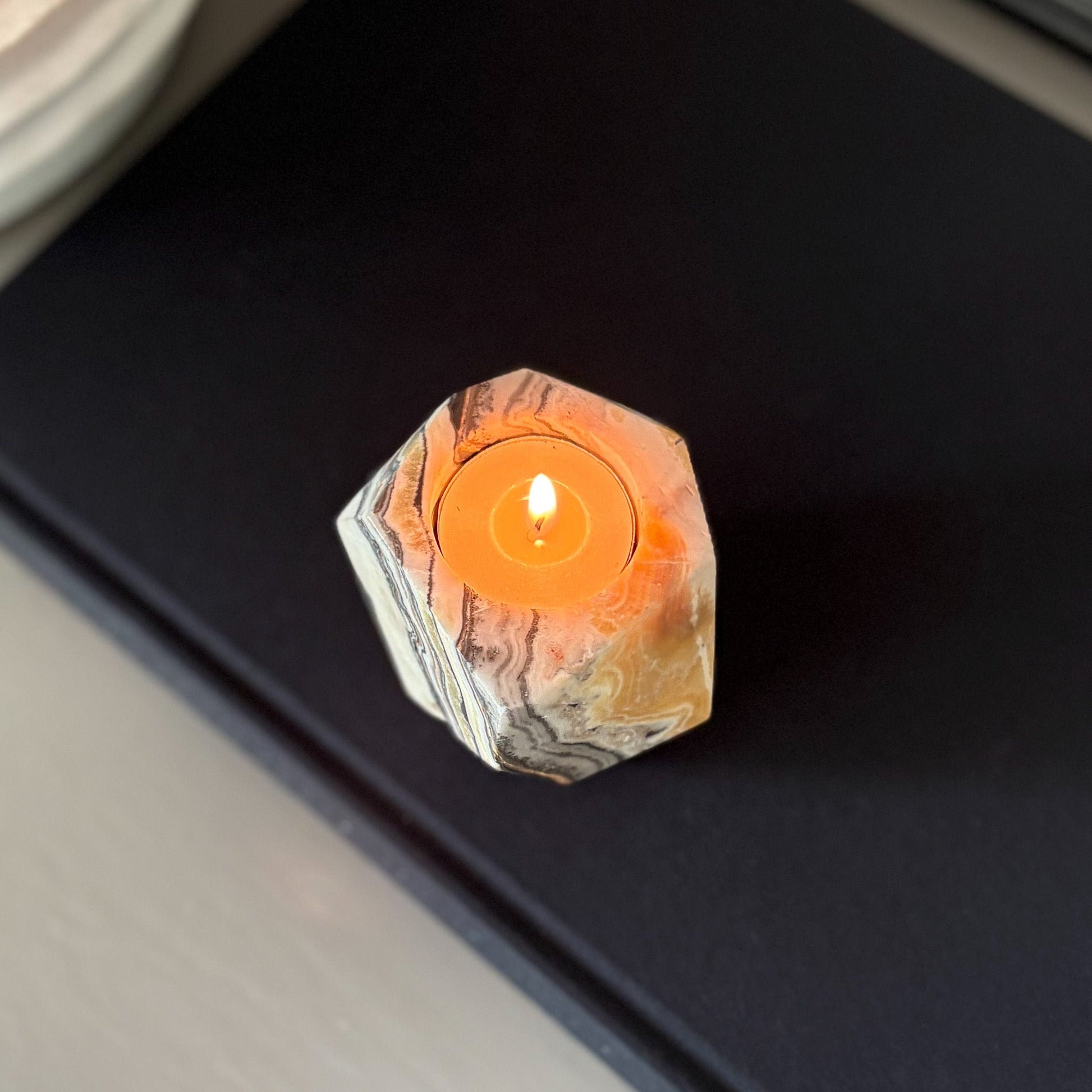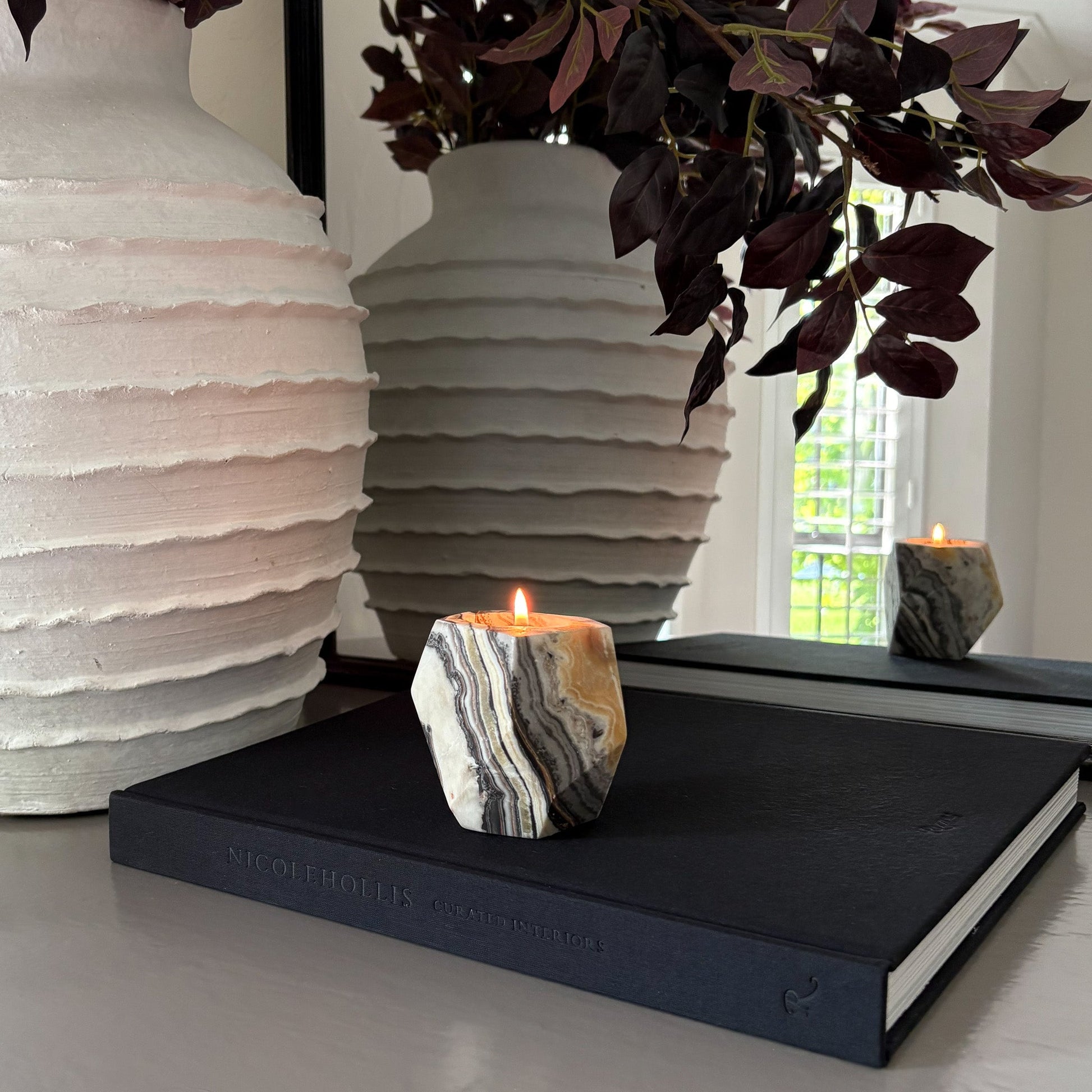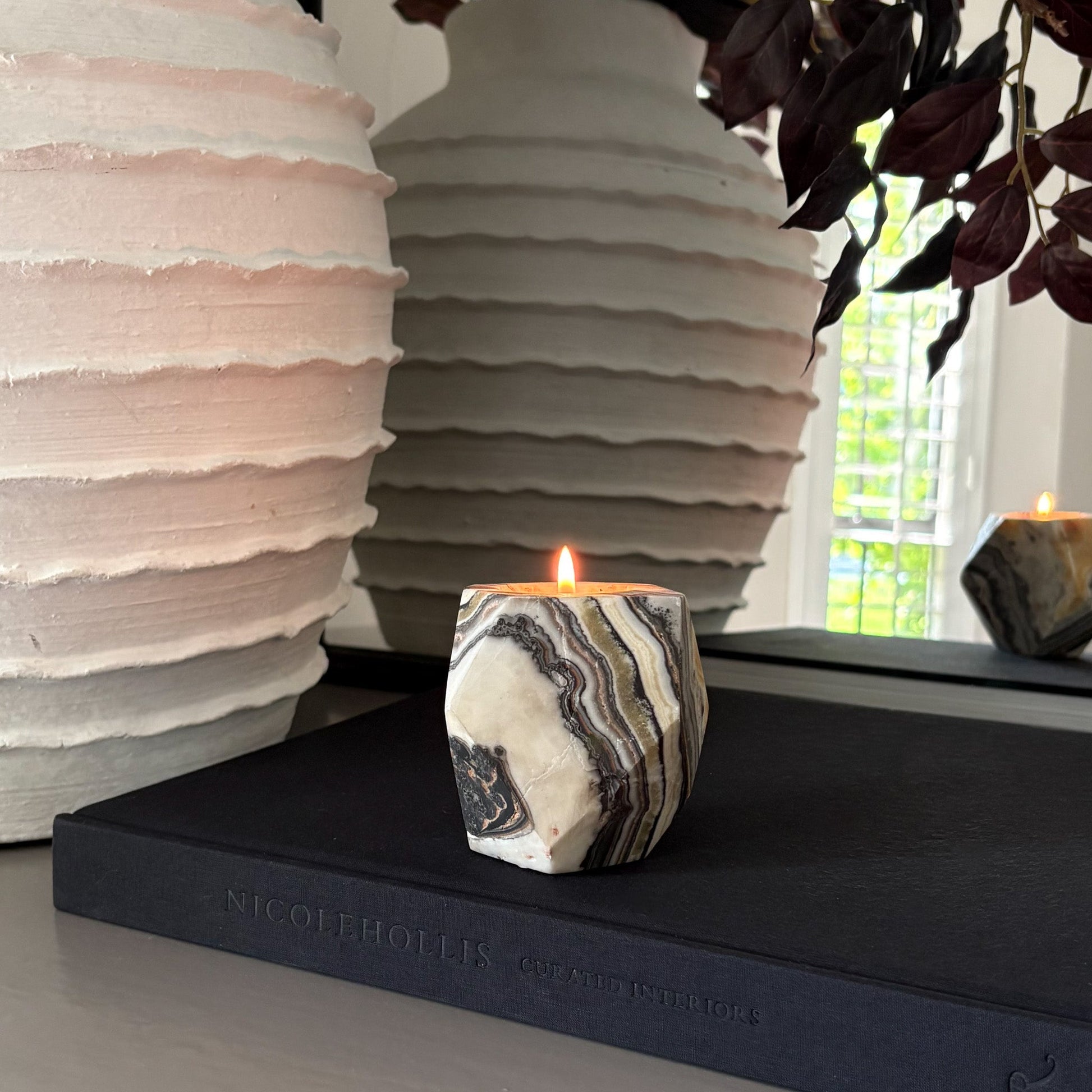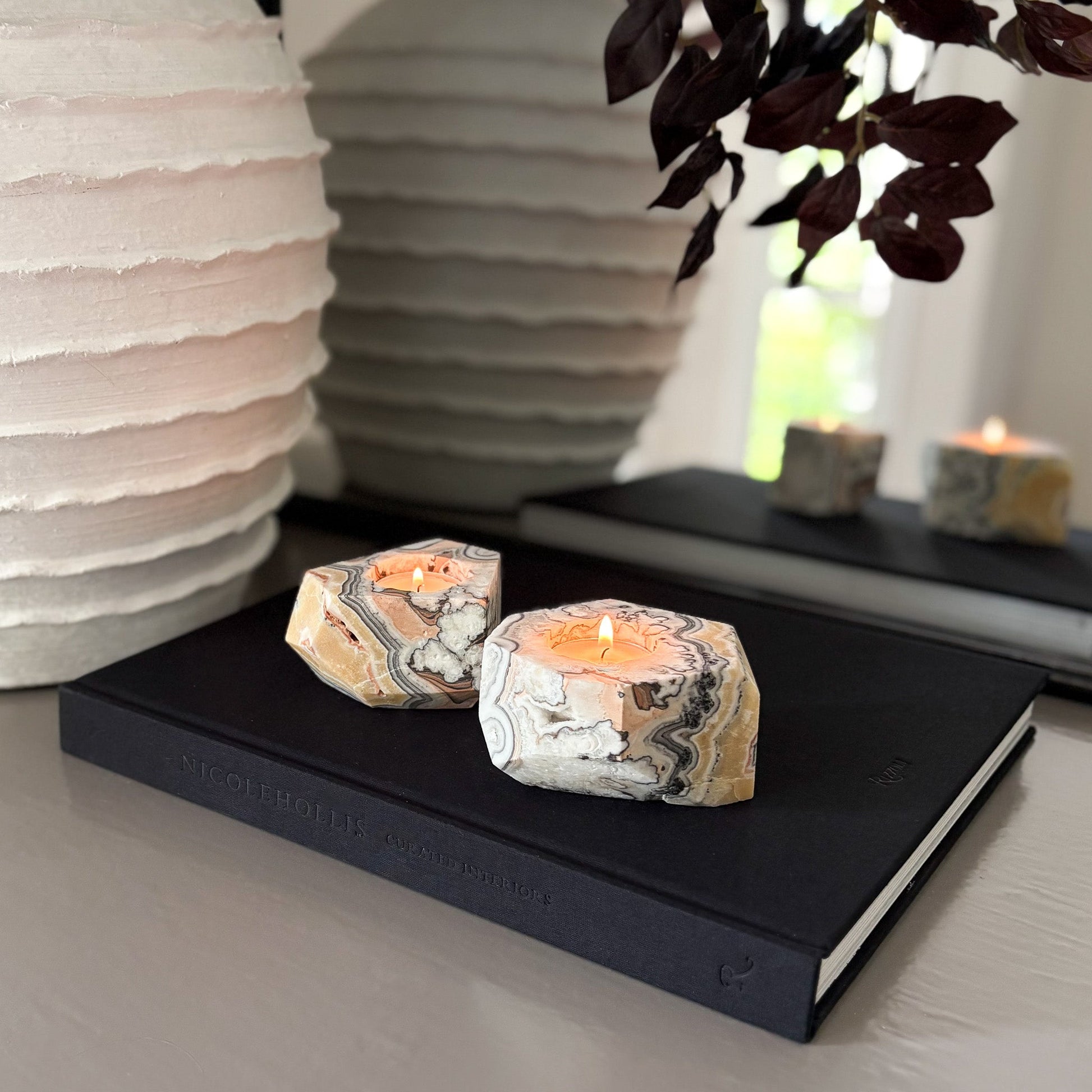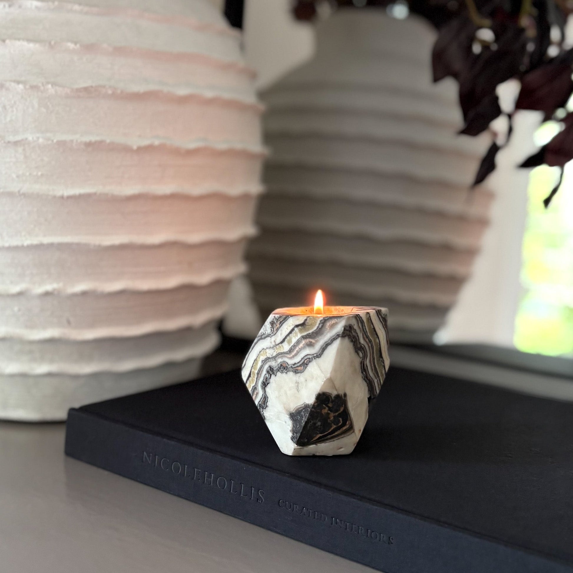Infuse your home with the grounding beauty of nature. Our Faceted Zebra Calcite Tealight Candle Holder is a striking fusion of natural artistry and ambient light. Carved from genuine Zebra Calcite, each piece features dramatic bands of cream, brown, and grey—each one unique, just like the rock it came from.