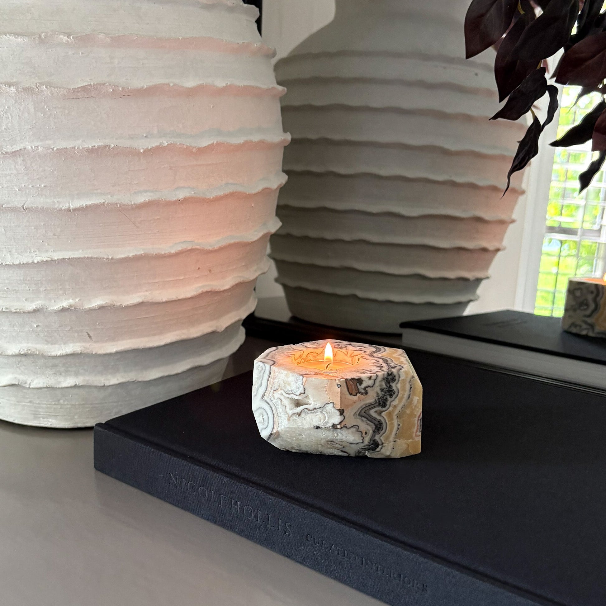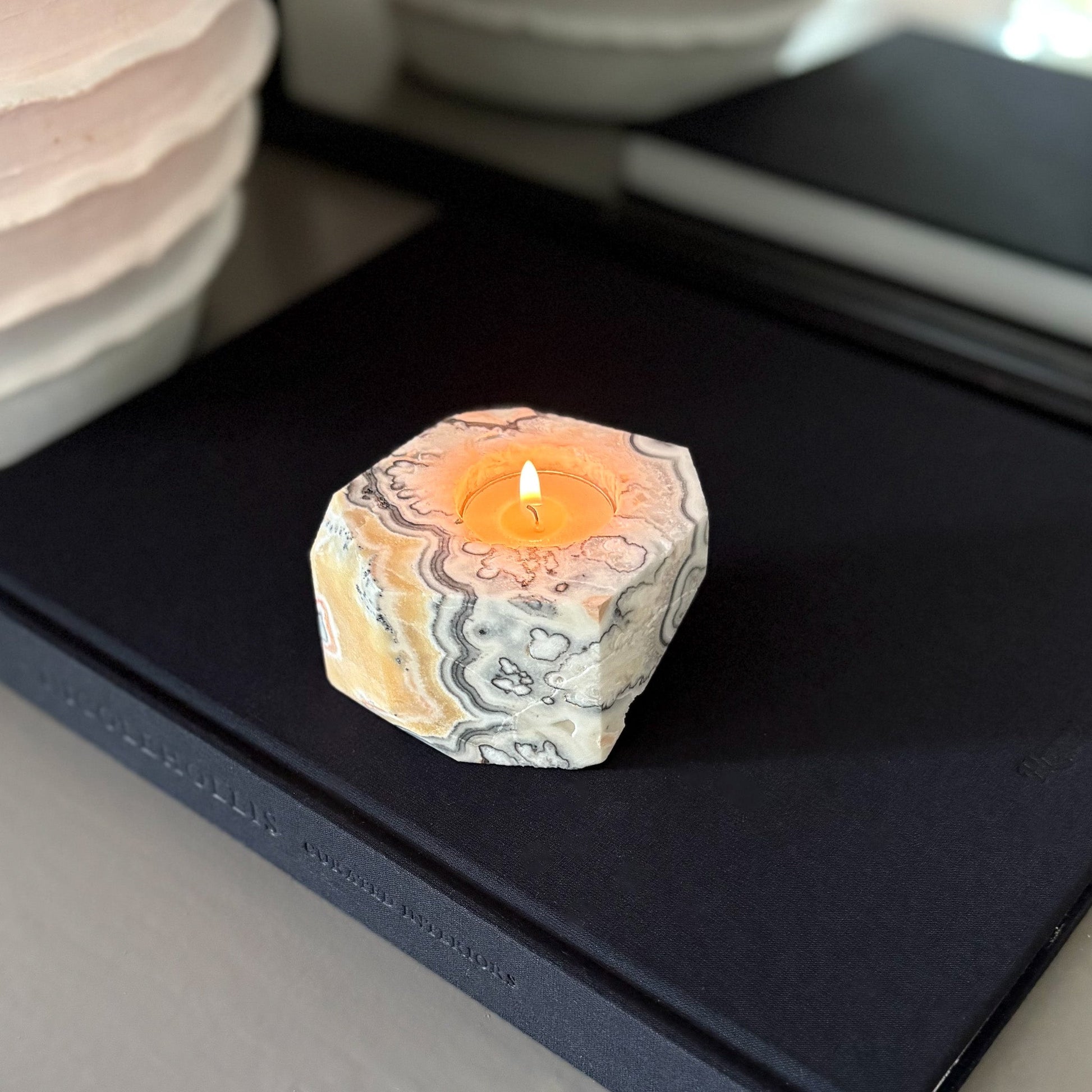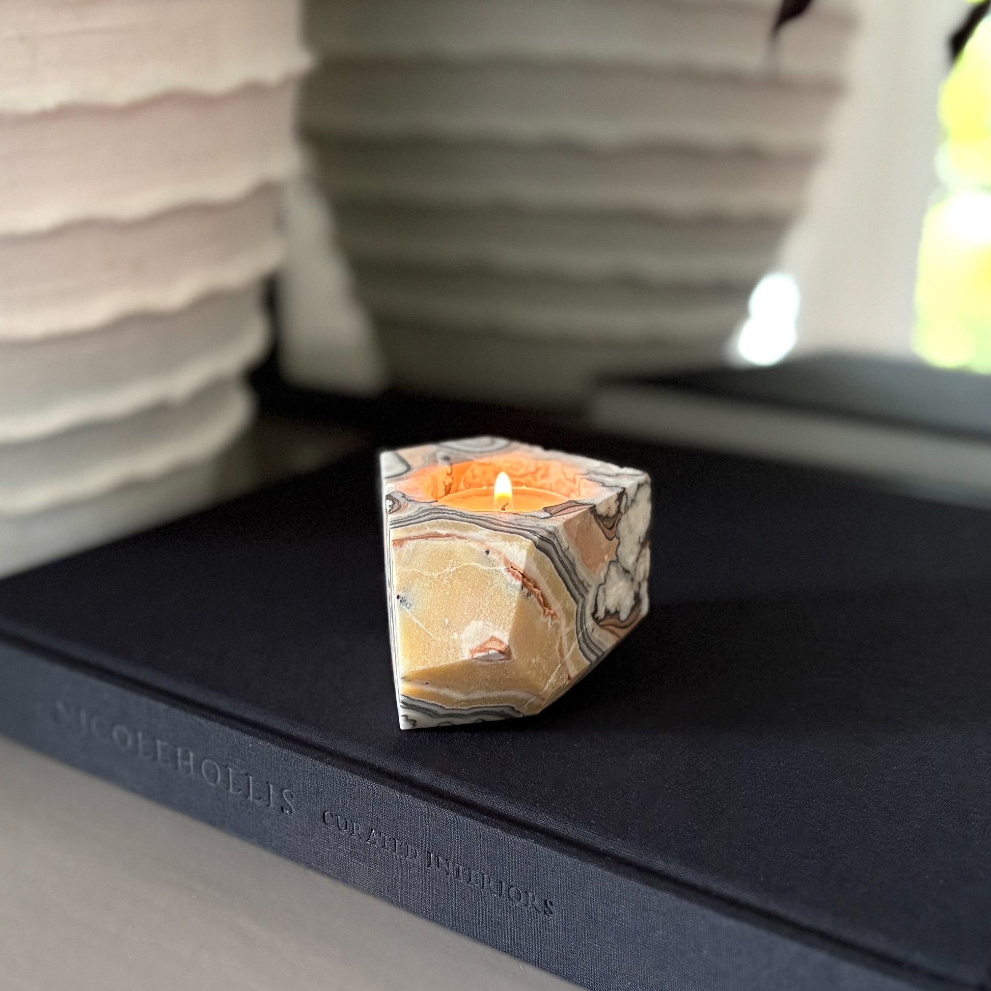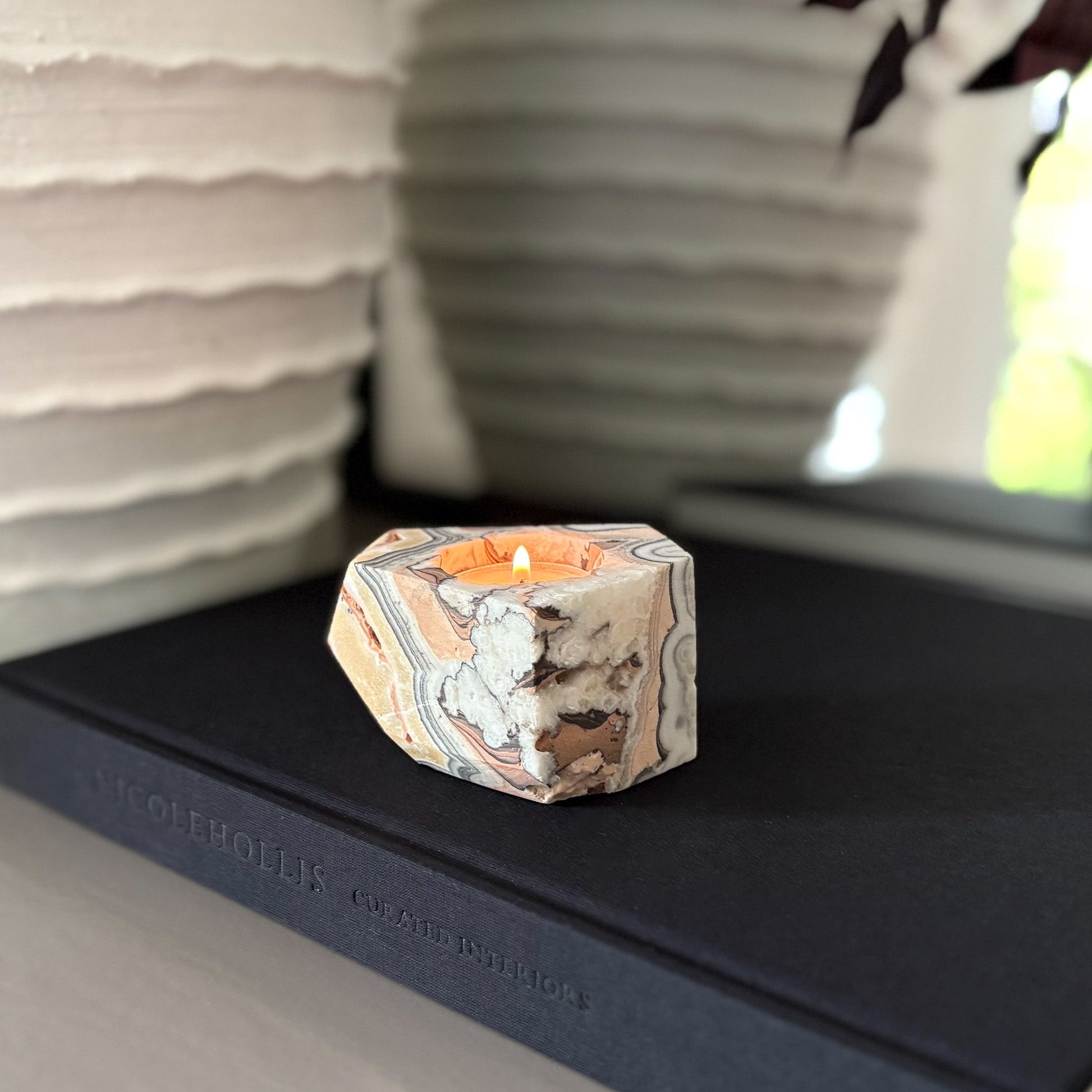 Infuse your home with the grounding beauty of nature. Our Faceted Zebra Calcite Tealight Candle Holder is a striking fusion of natural artistry and ambient light. Carved from genuine Zebra Calcite, each piece features dramatic bands of cream, brown, and grey—each one unique, just like the rock it came from.