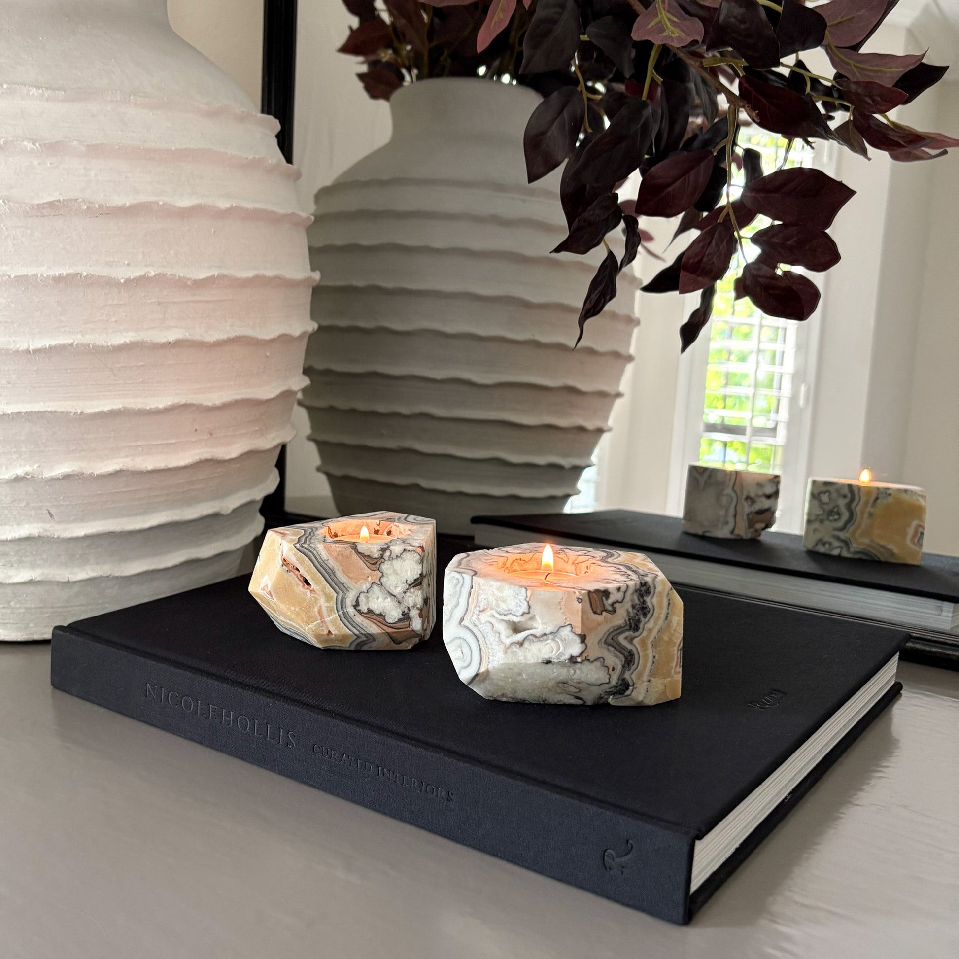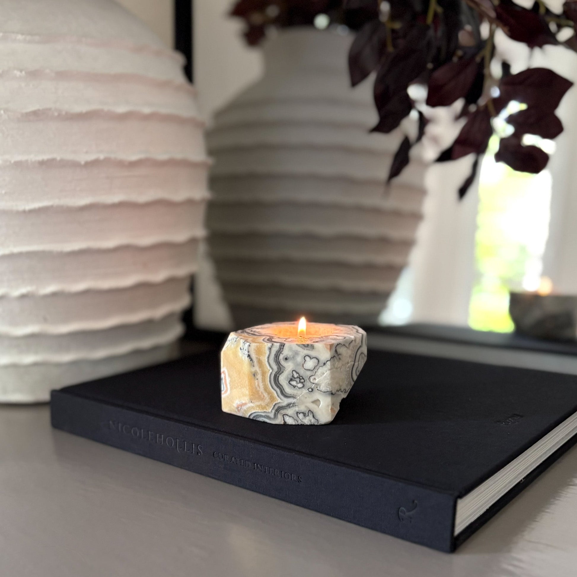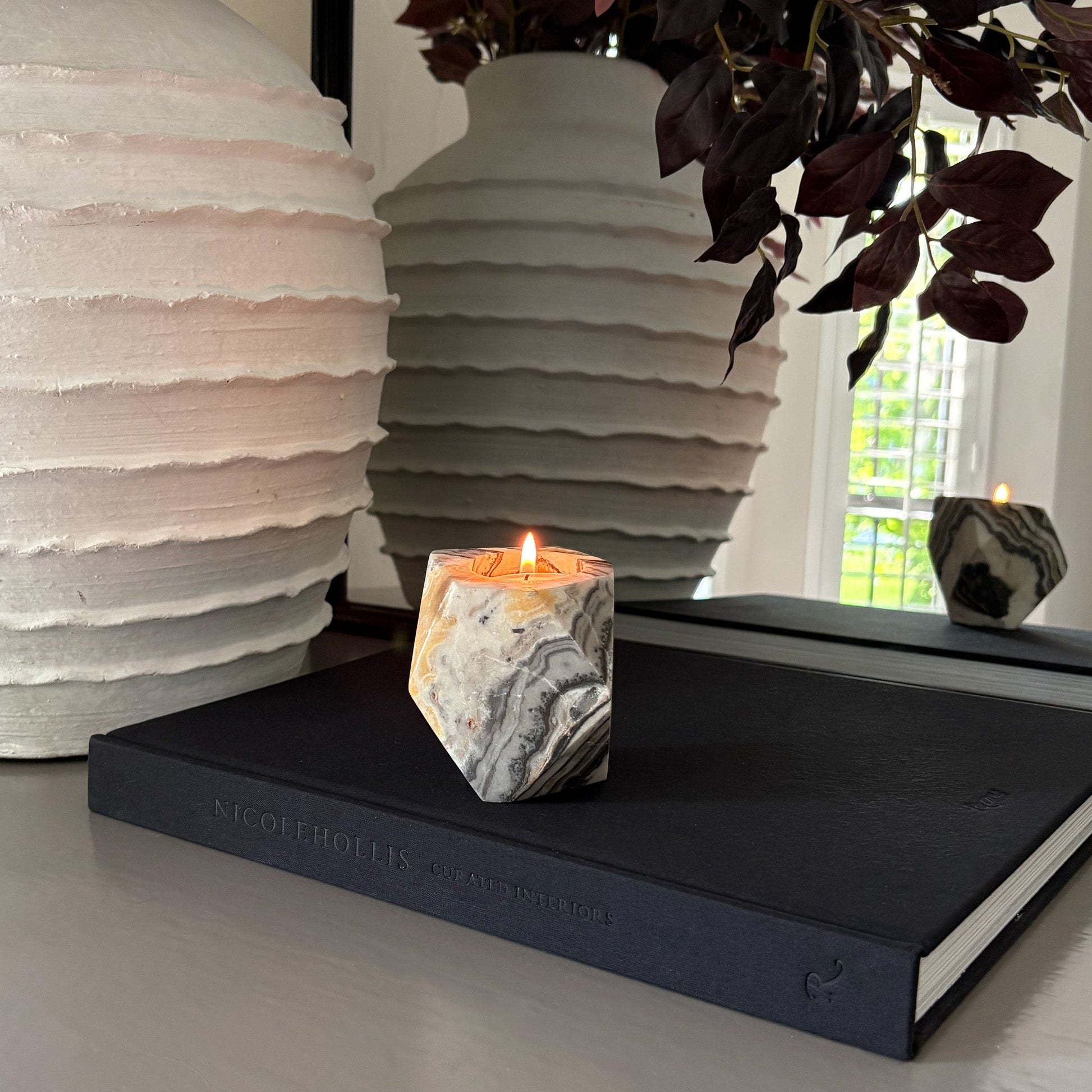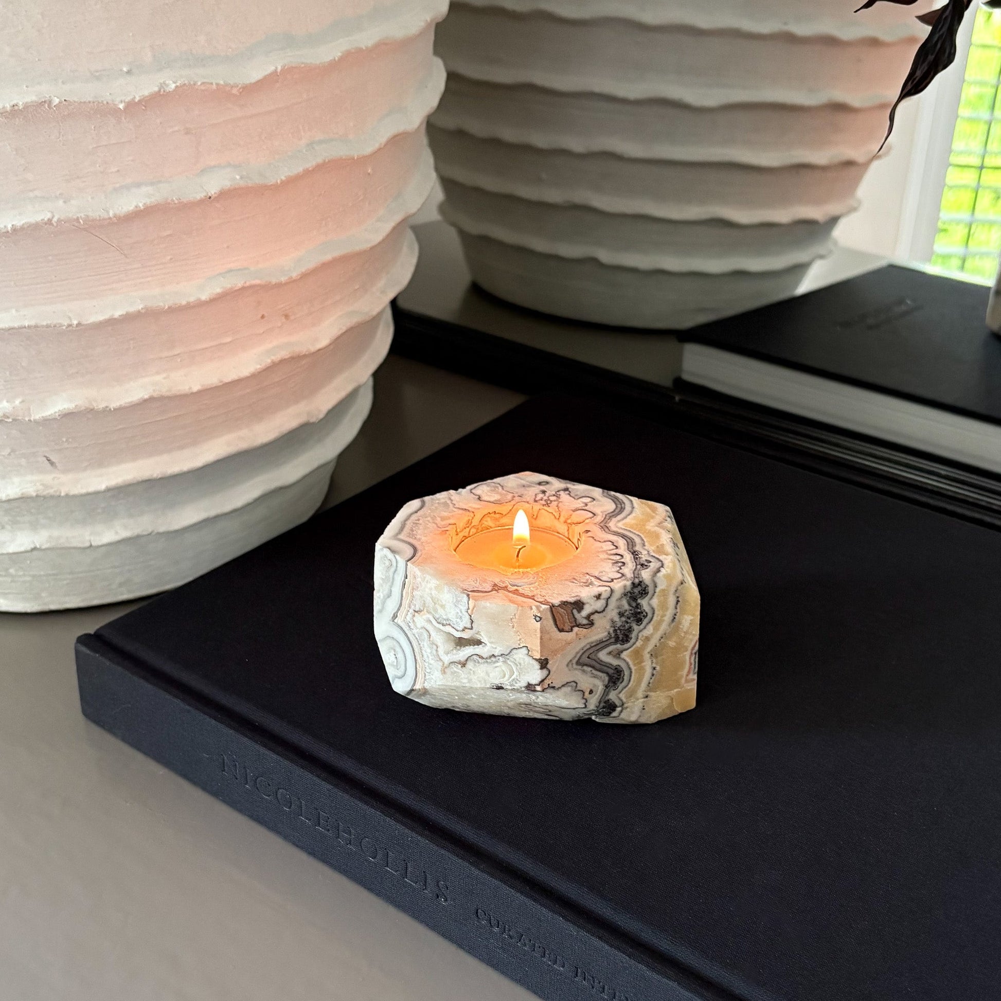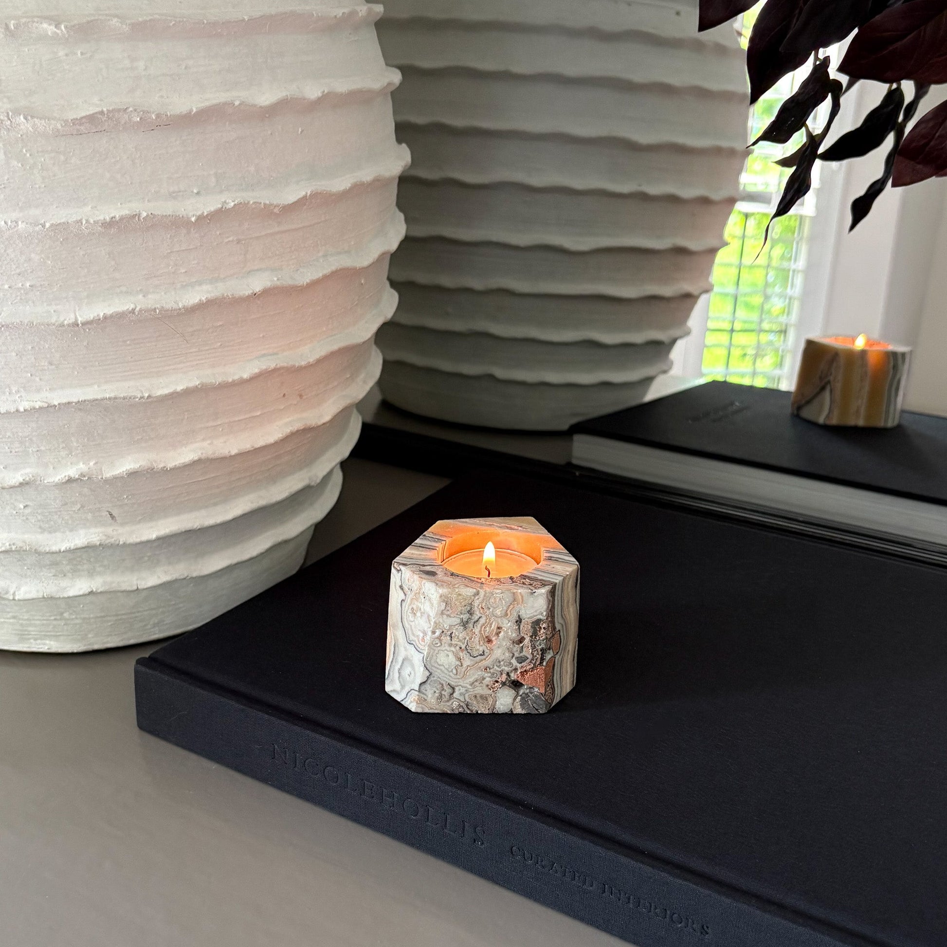 Infuse your home with the grounding beauty of nature. Our Faceted Zebra Calcite Tealight Candle Holder is a striking fusion of natural artistry and ambient light. Carved from genuine Zebra Calcite, each piece features dramatic bands of cream, brown, and grey—each one unique, just like the rock it came from.