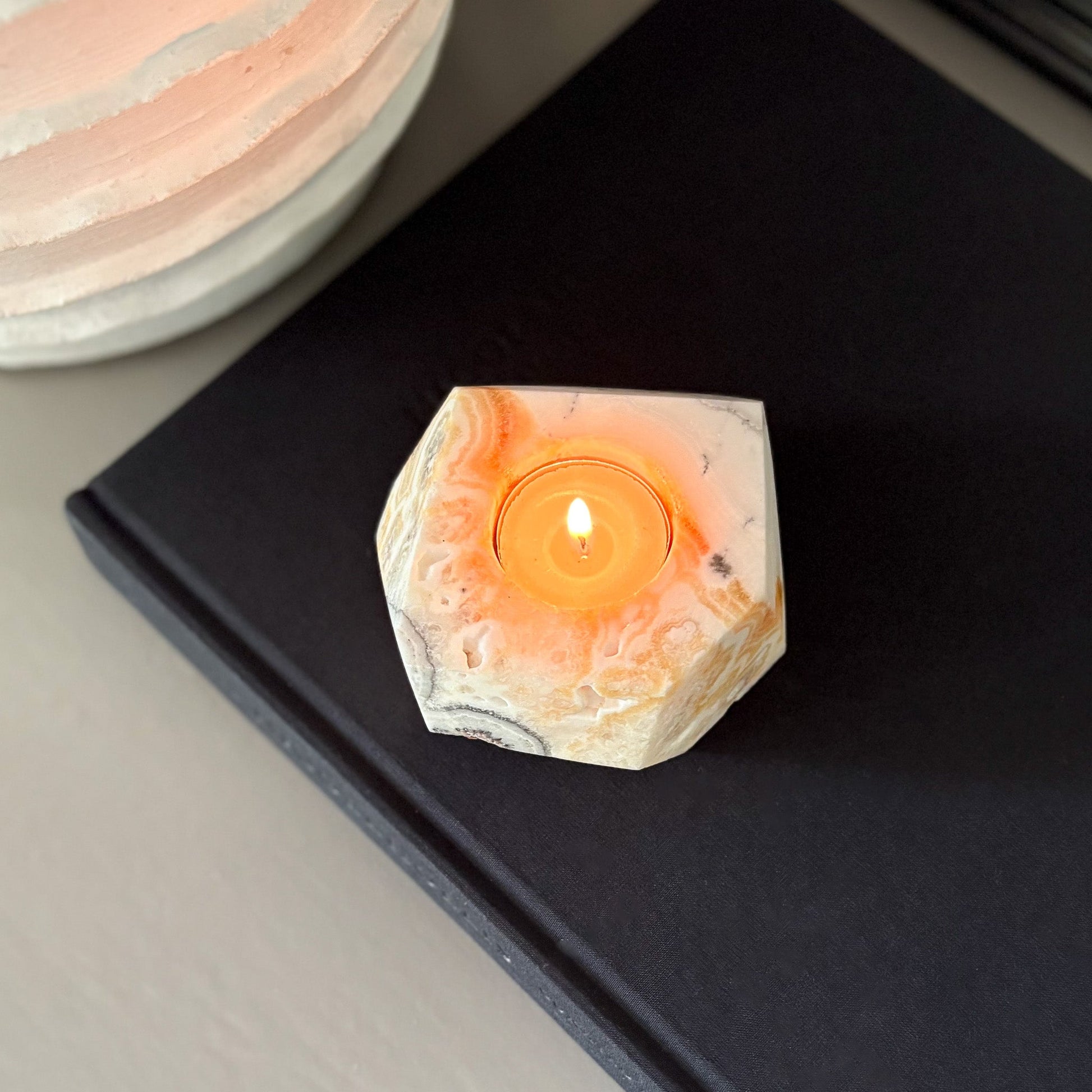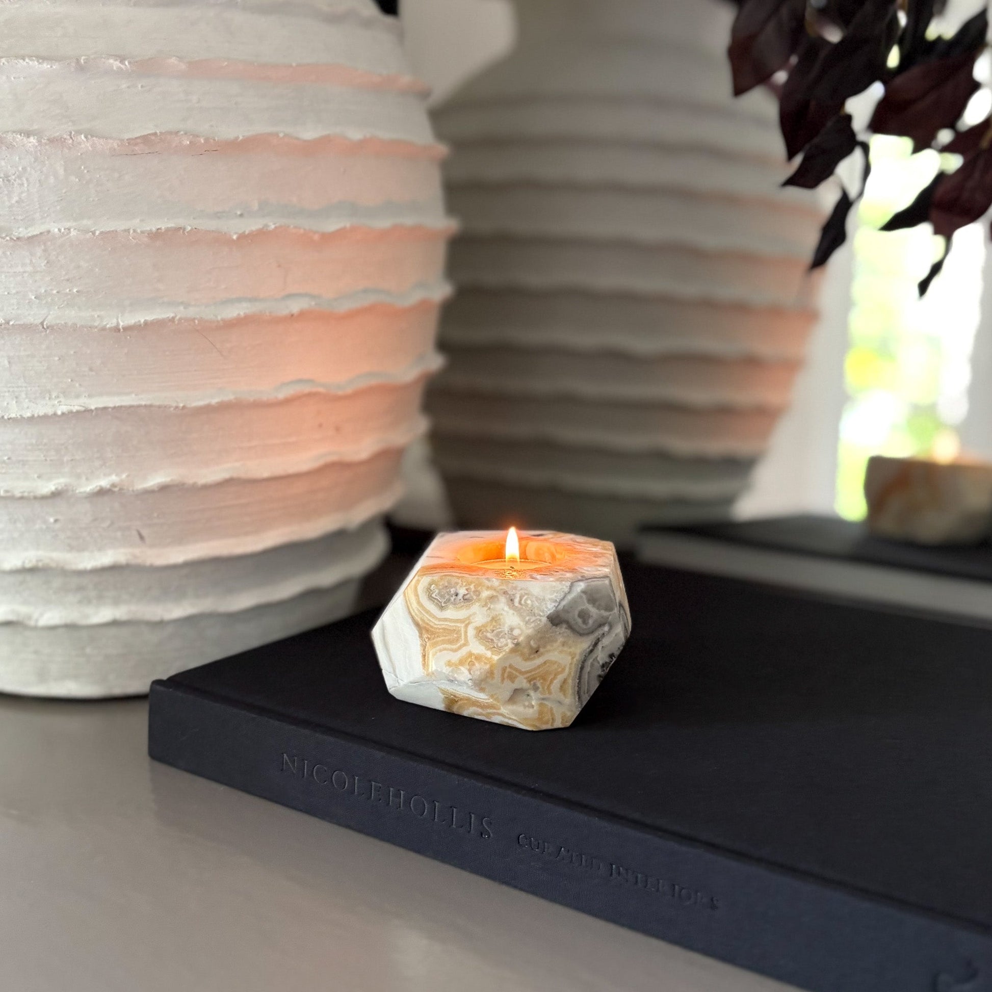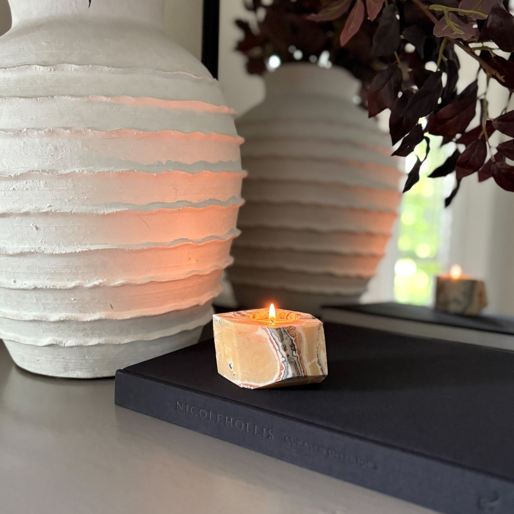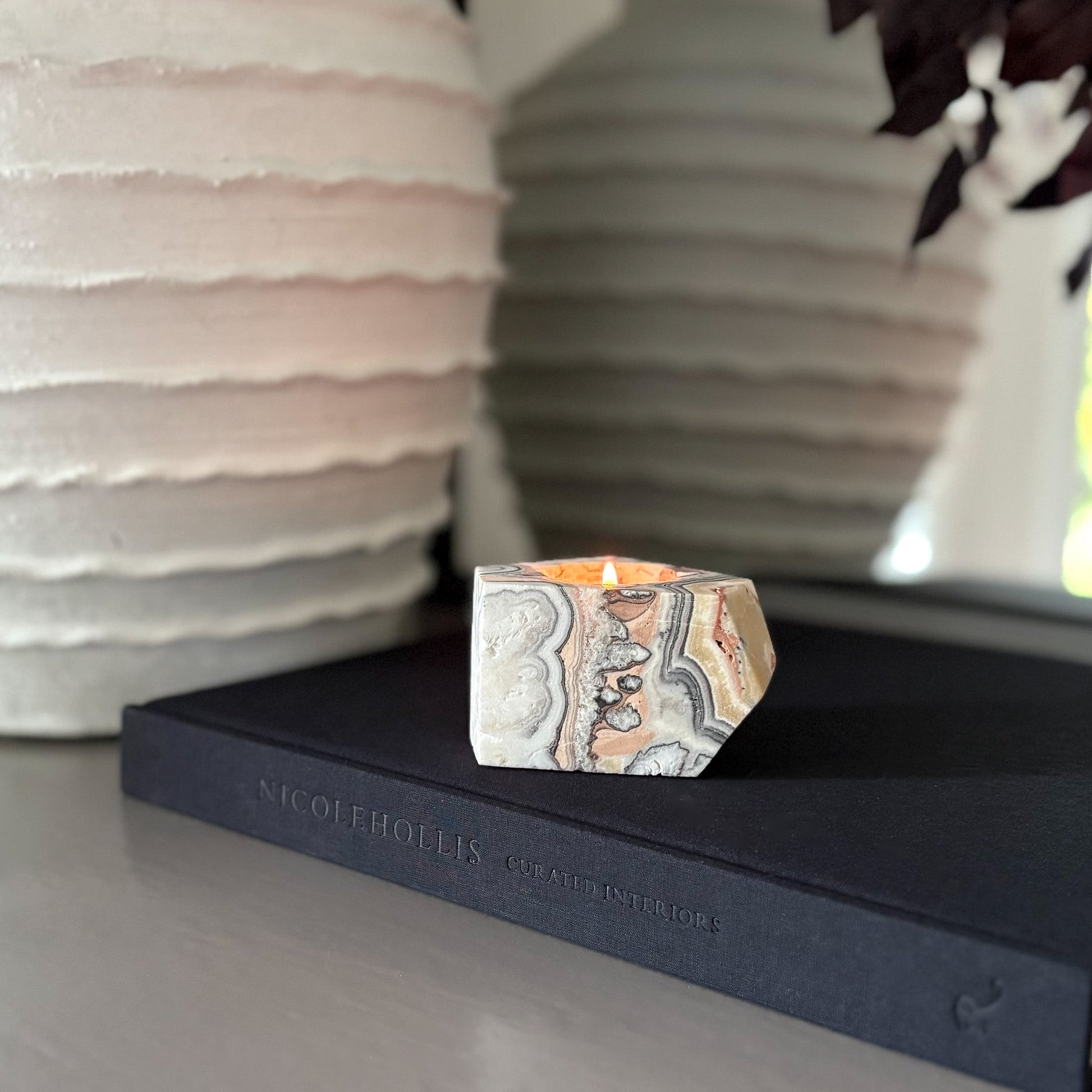 Infuse your home with the grounding beauty of nature. Our Faceted Zebra Calcite Tealight Candle Holder is a striking fusion of natural artistry and ambient light. Carved from genuine Zebra Calcite, each piece features dramatic bands of cream, brown, and grey—each one unique, just like the rock it came from.