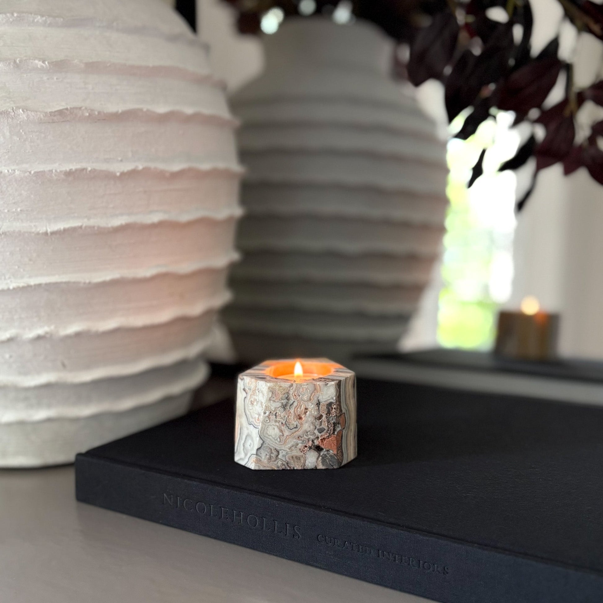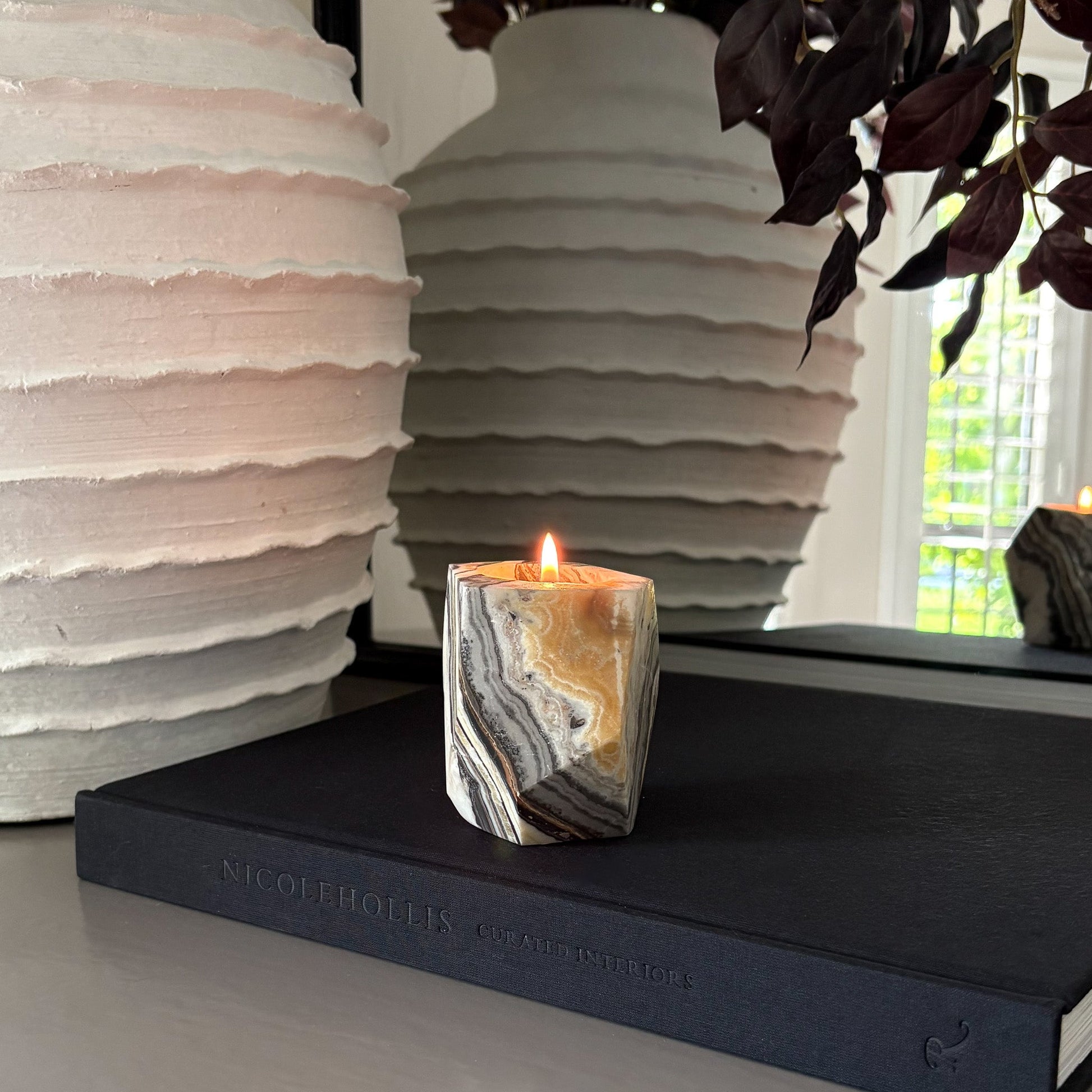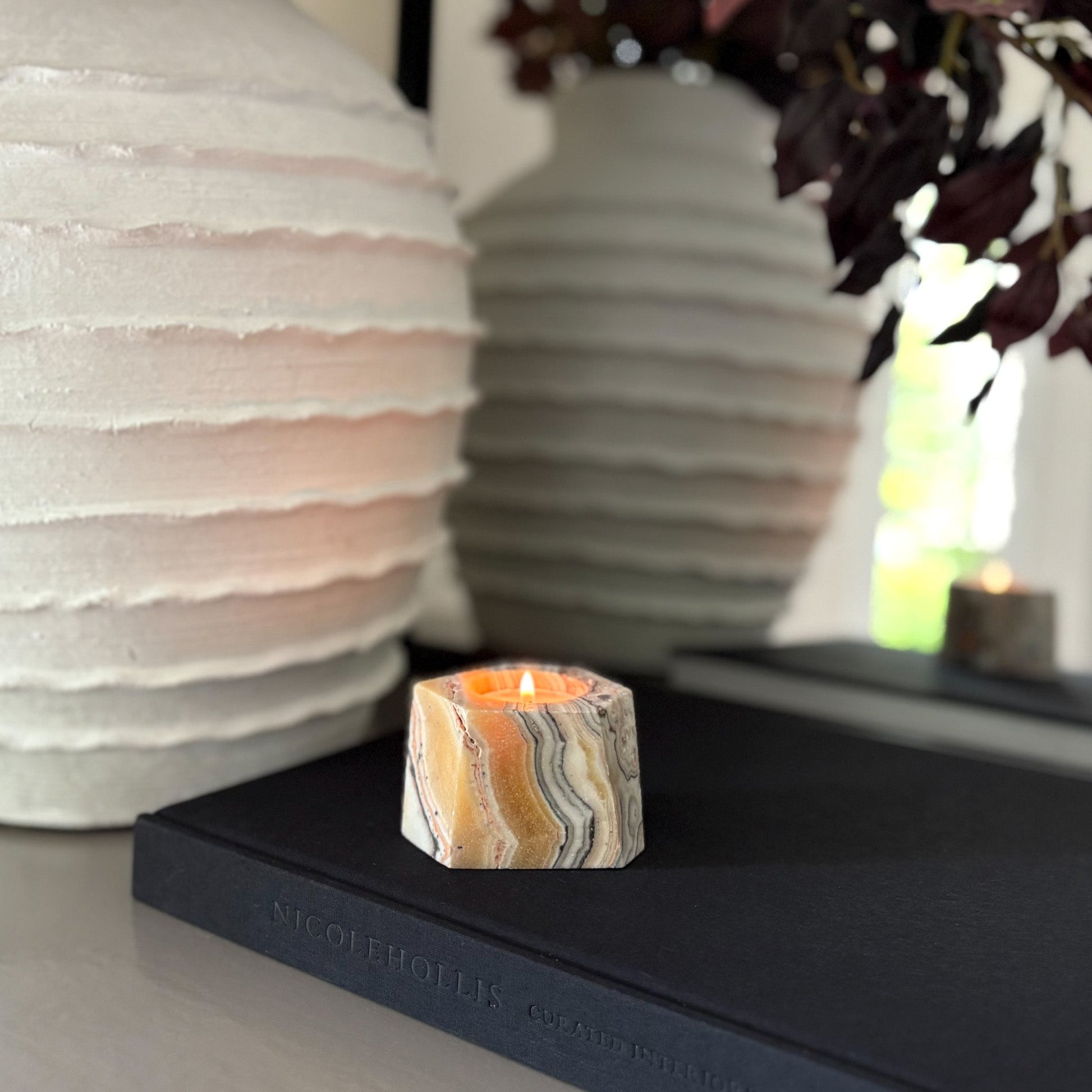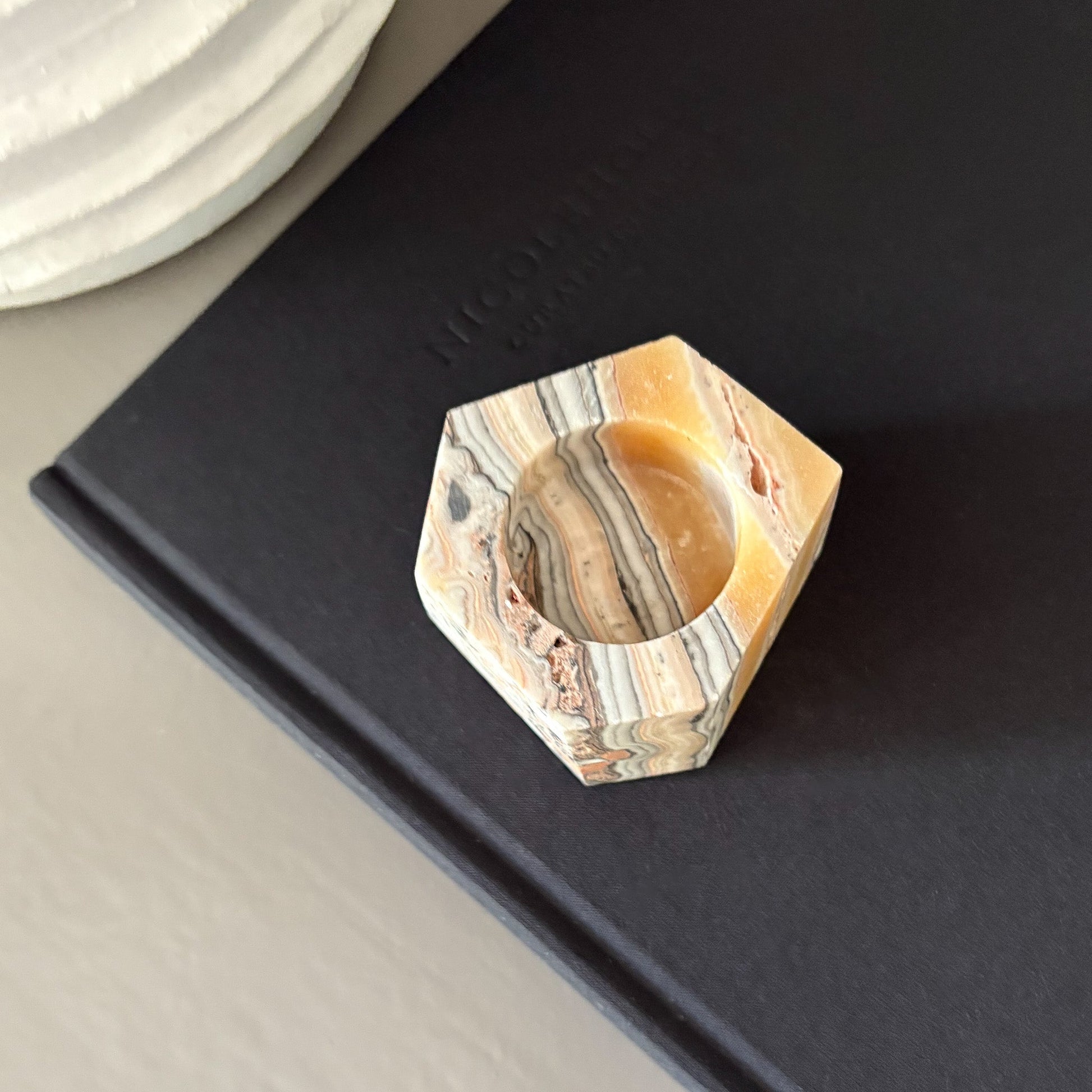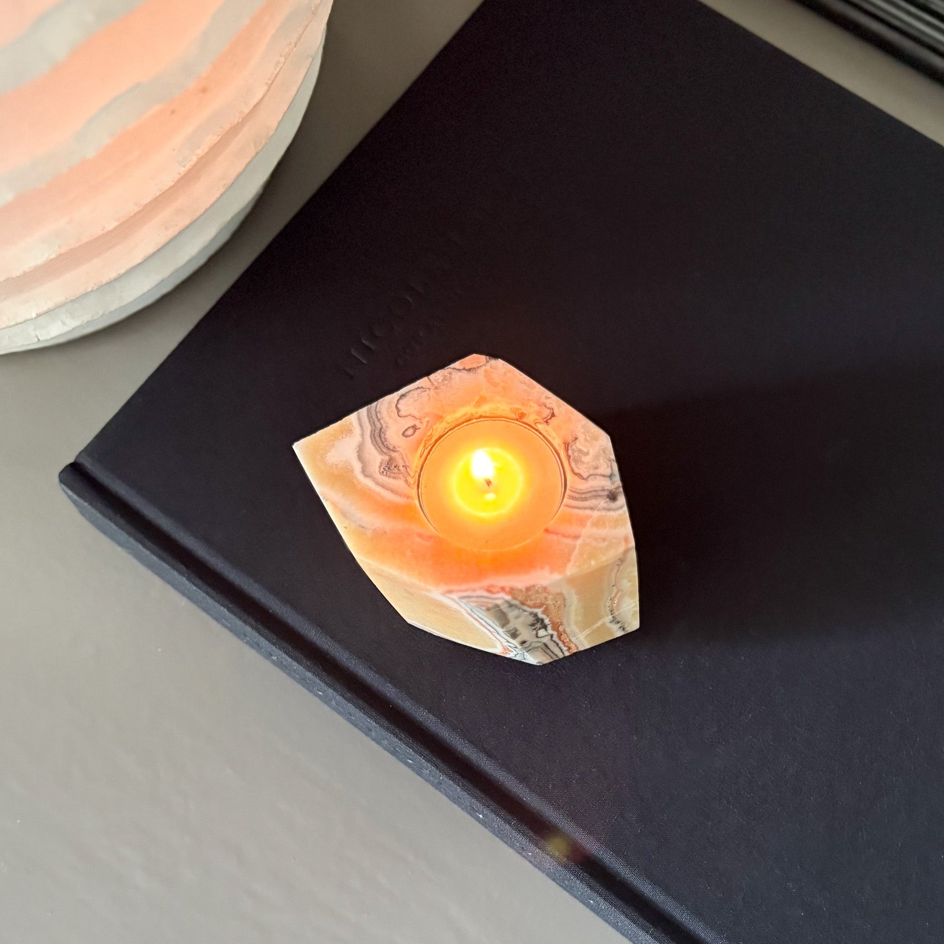 Infuse your home with the grounding beauty of nature. Our Faceted Zebra Calcite Tealight Candle Holder is a striking fusion of natural artistry and ambient light. Carved from genuine Zebra Calcite, each piece features dramatic bands of cream, brown, and grey—each one unique, just like the rock it came from.
