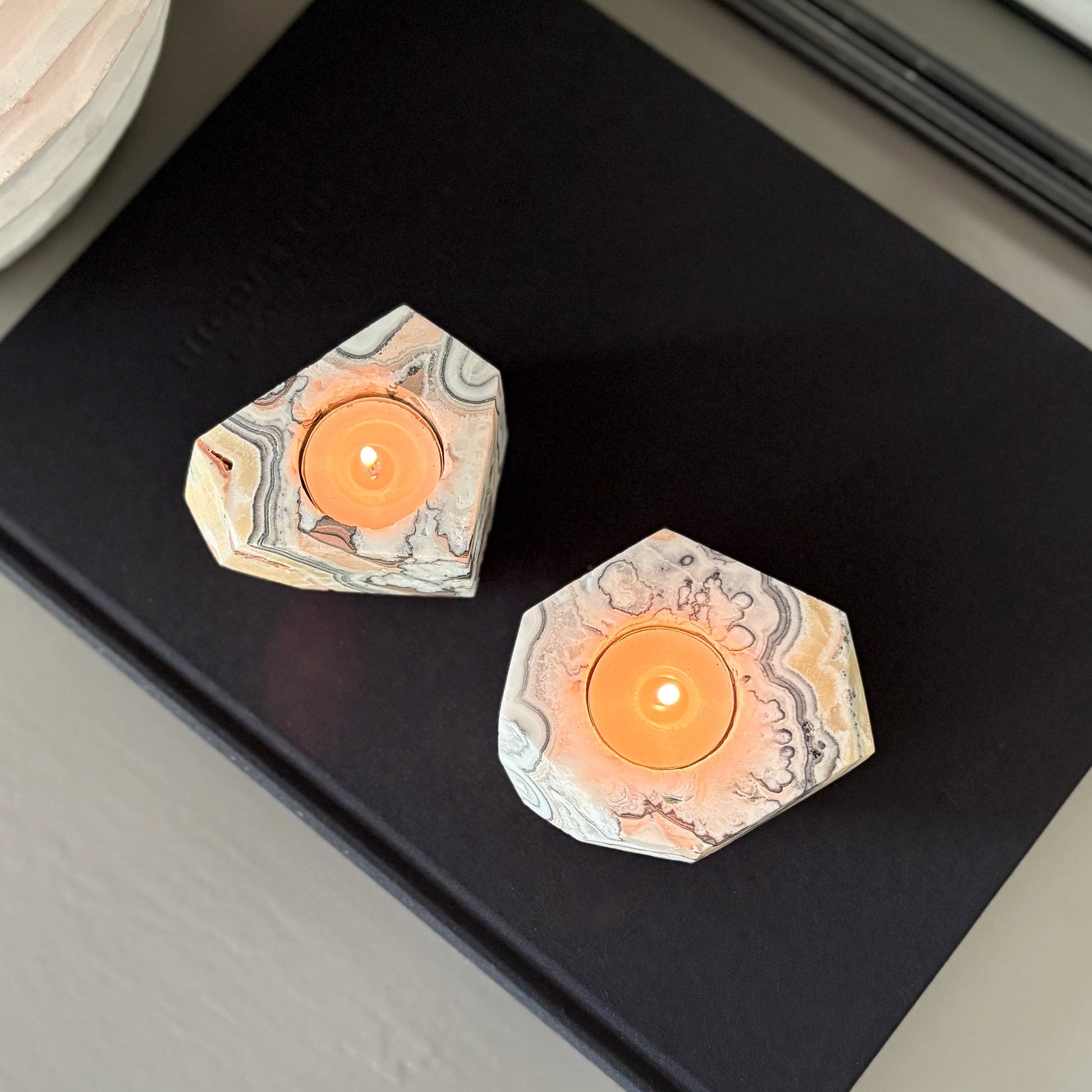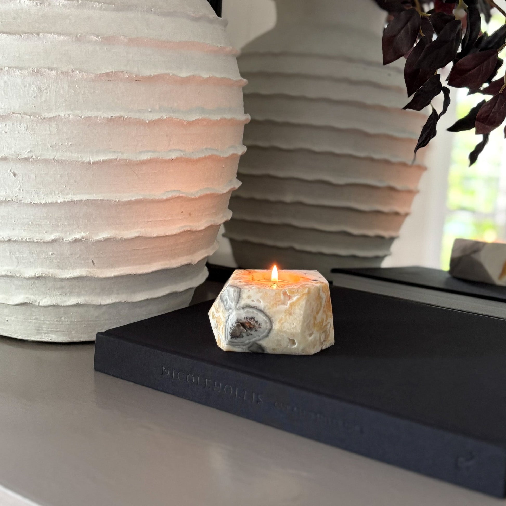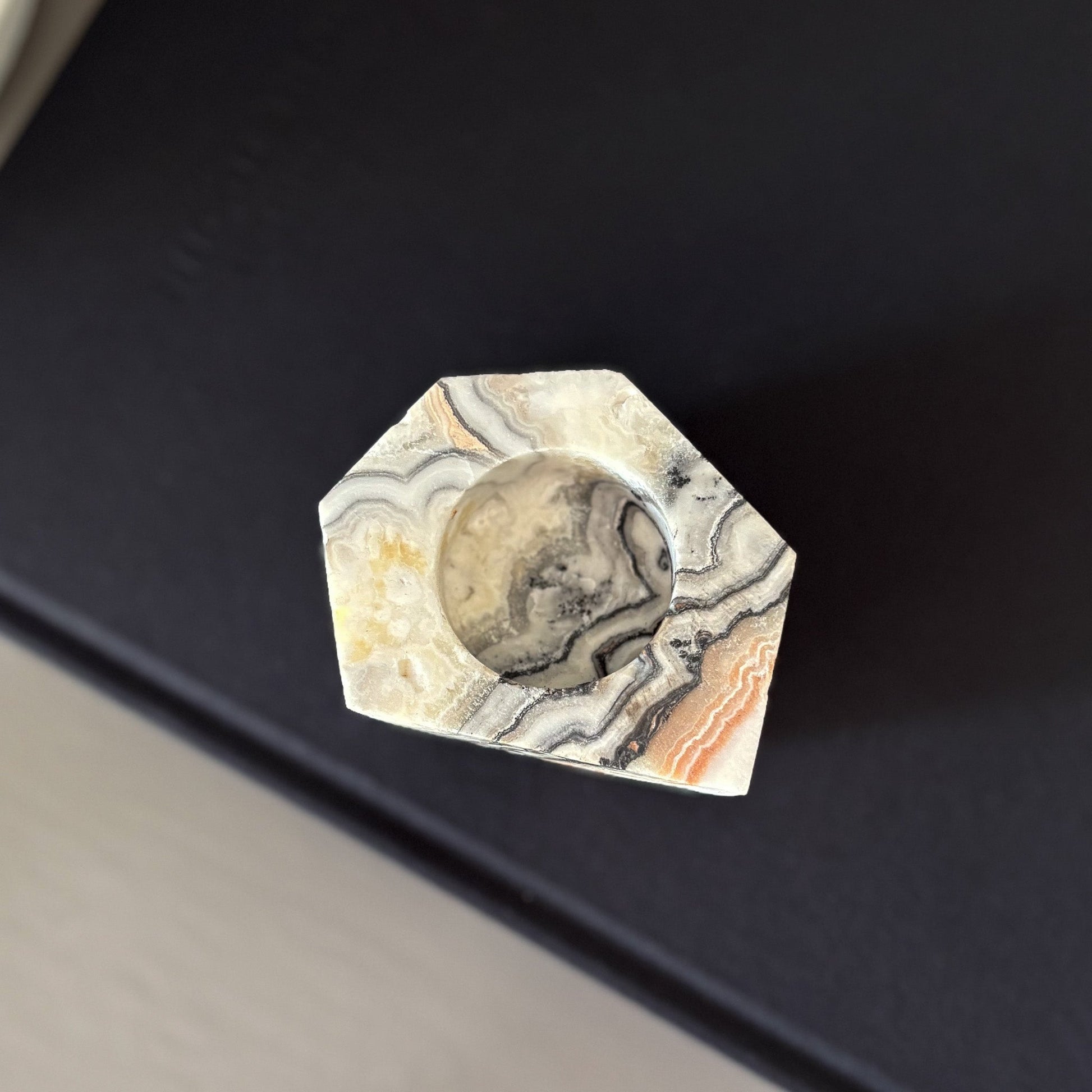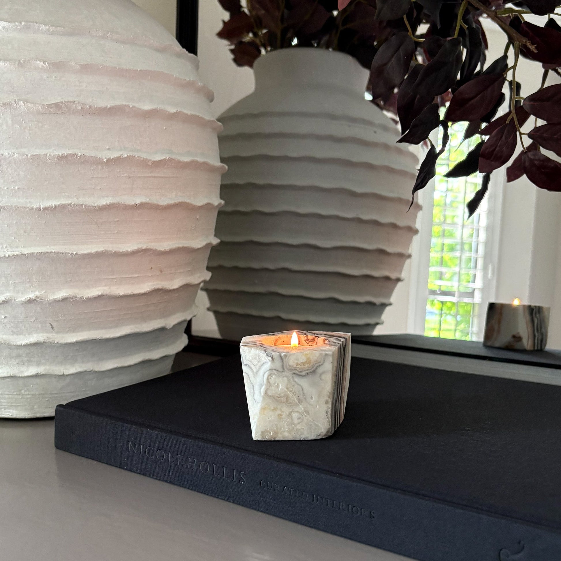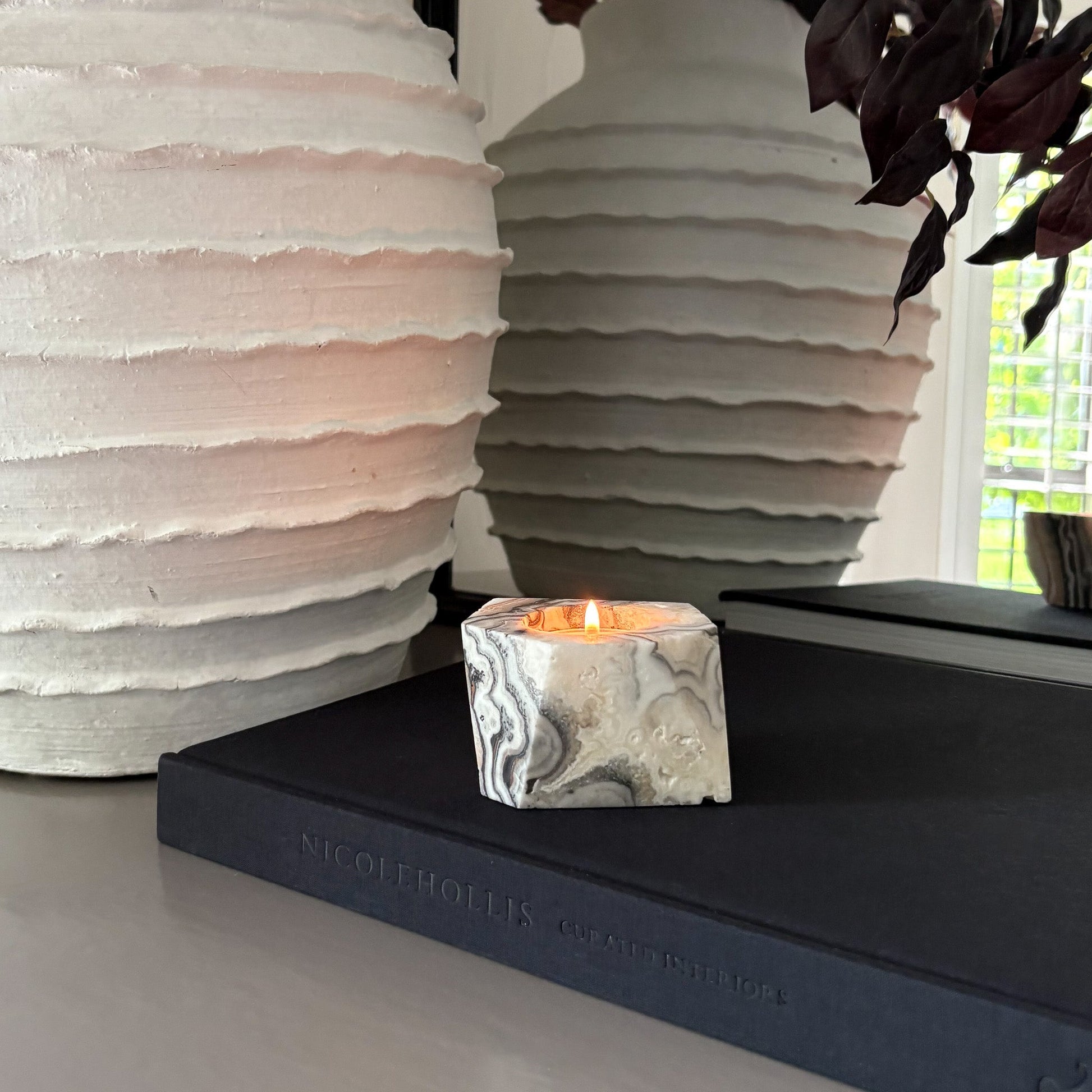 Infuse your home with the grounding beauty of nature. Our Faceted Zebra Calcite Tealight Candle Holder is a striking fusion of natural artistry and ambient light. Carved from genuine Zebra Calcite, each piece features dramatic bands of cream, brown, and grey—each one unique, just like the rock it came from.