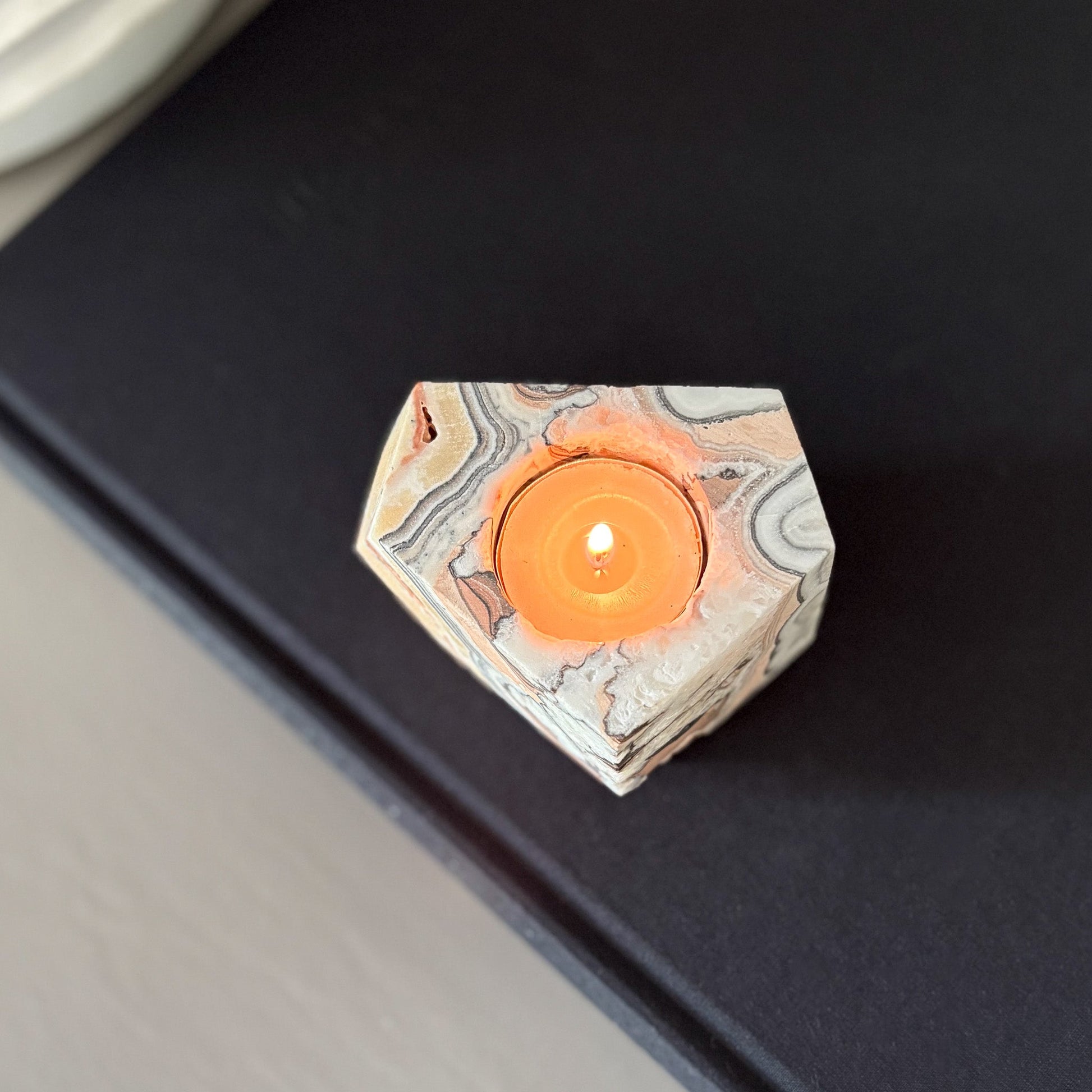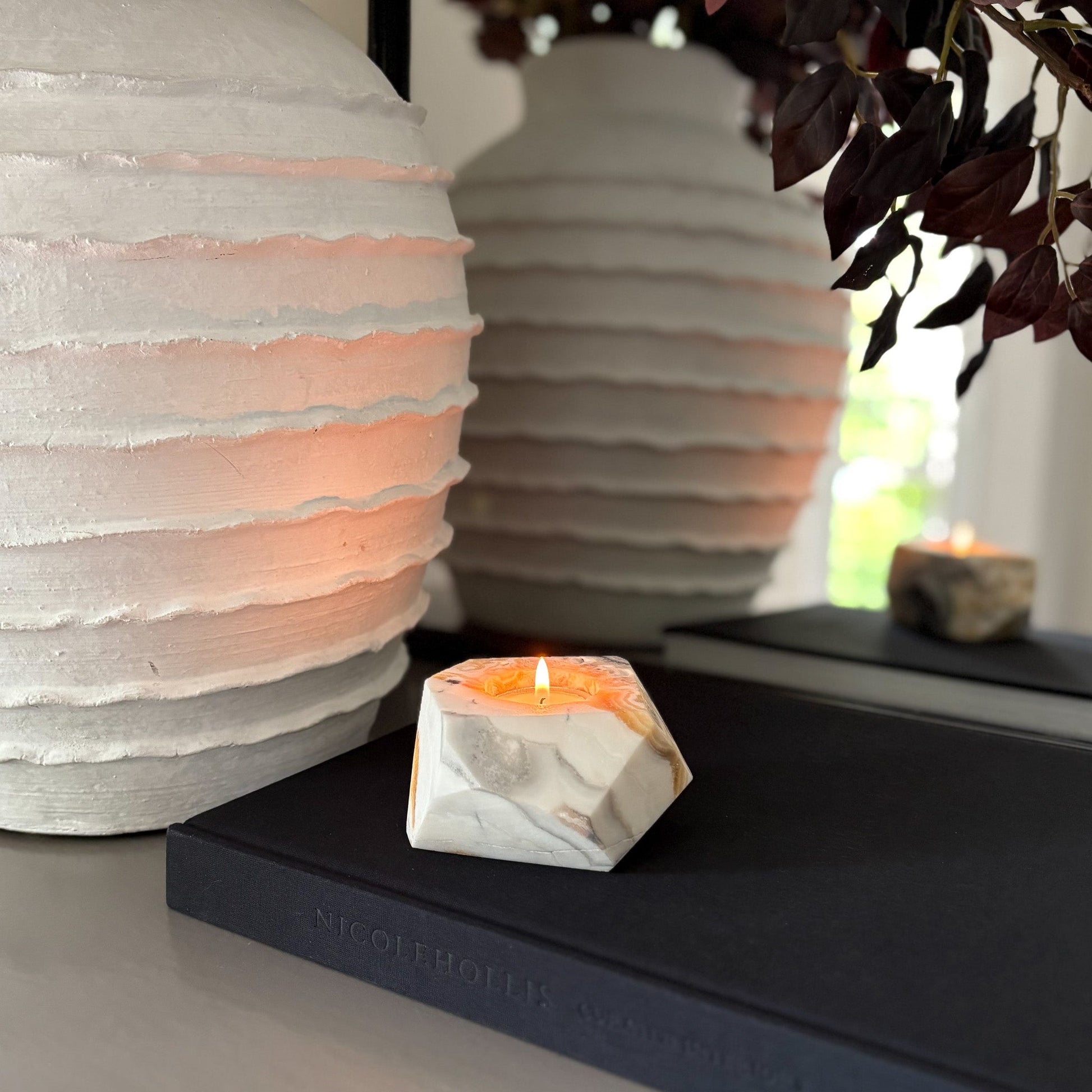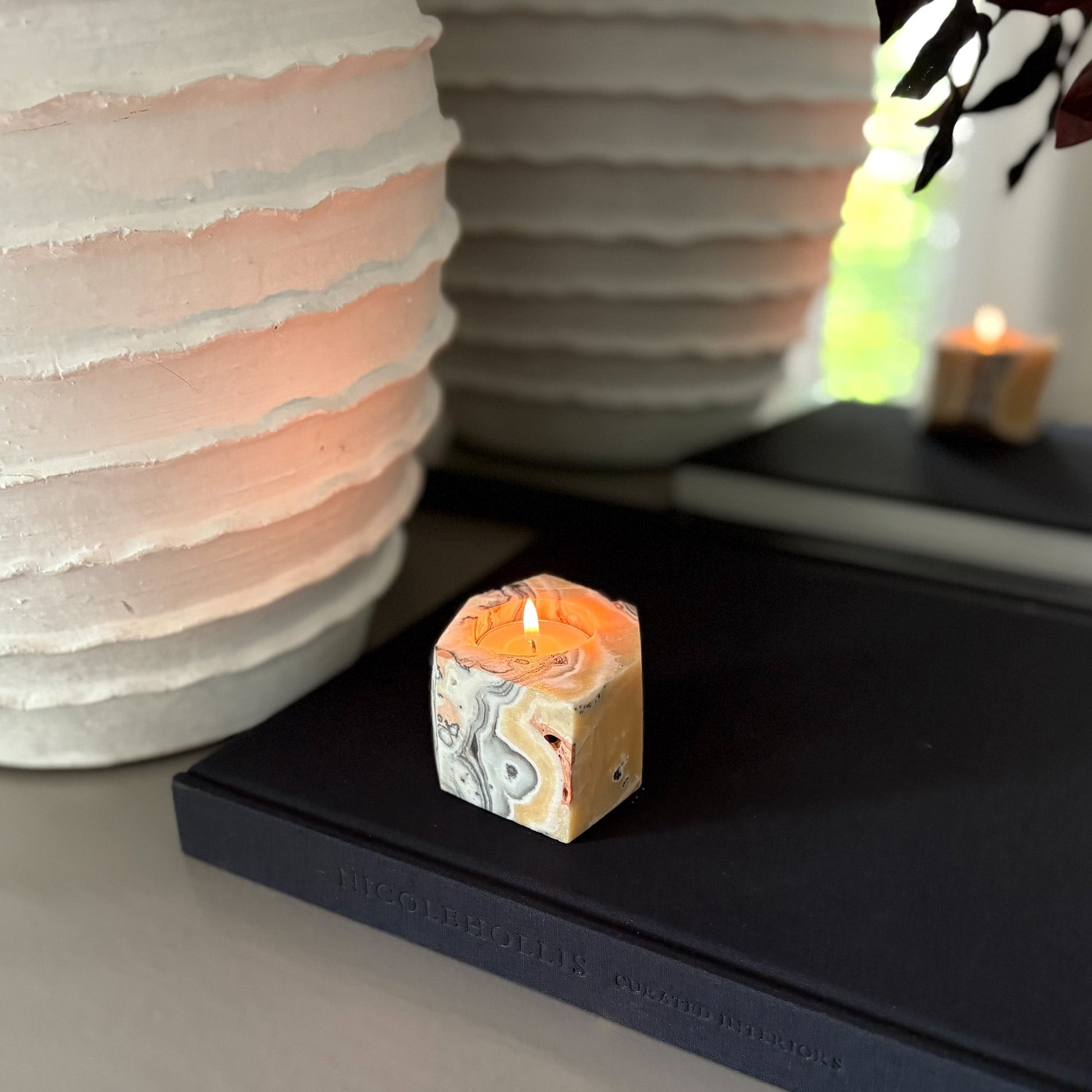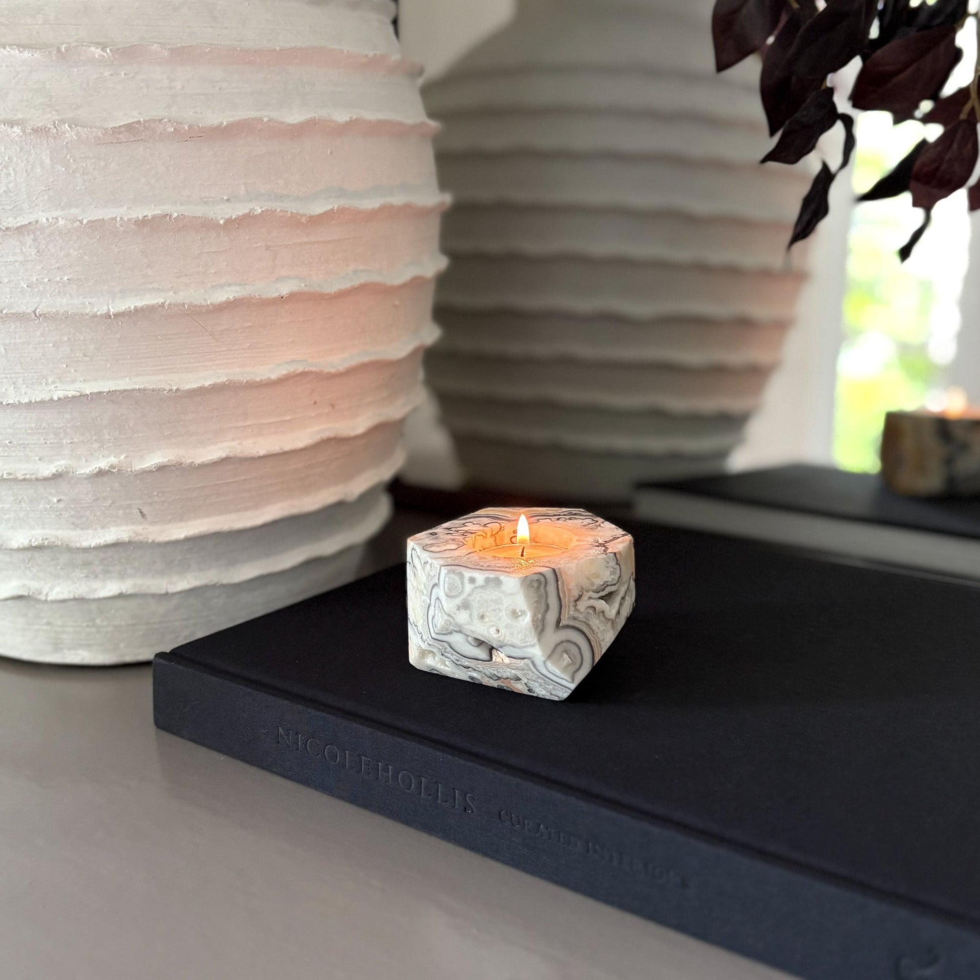 Infuse your home with the grounding beauty of nature. Our Faceted Zebra Calcite Tealight Candle Holder is a striking fusion of natural artistry and ambient light. Carved from genuine Zebra Calcite, each piece features dramatic bands of cream, brown, and grey—each one unique, just like the rock it came from.