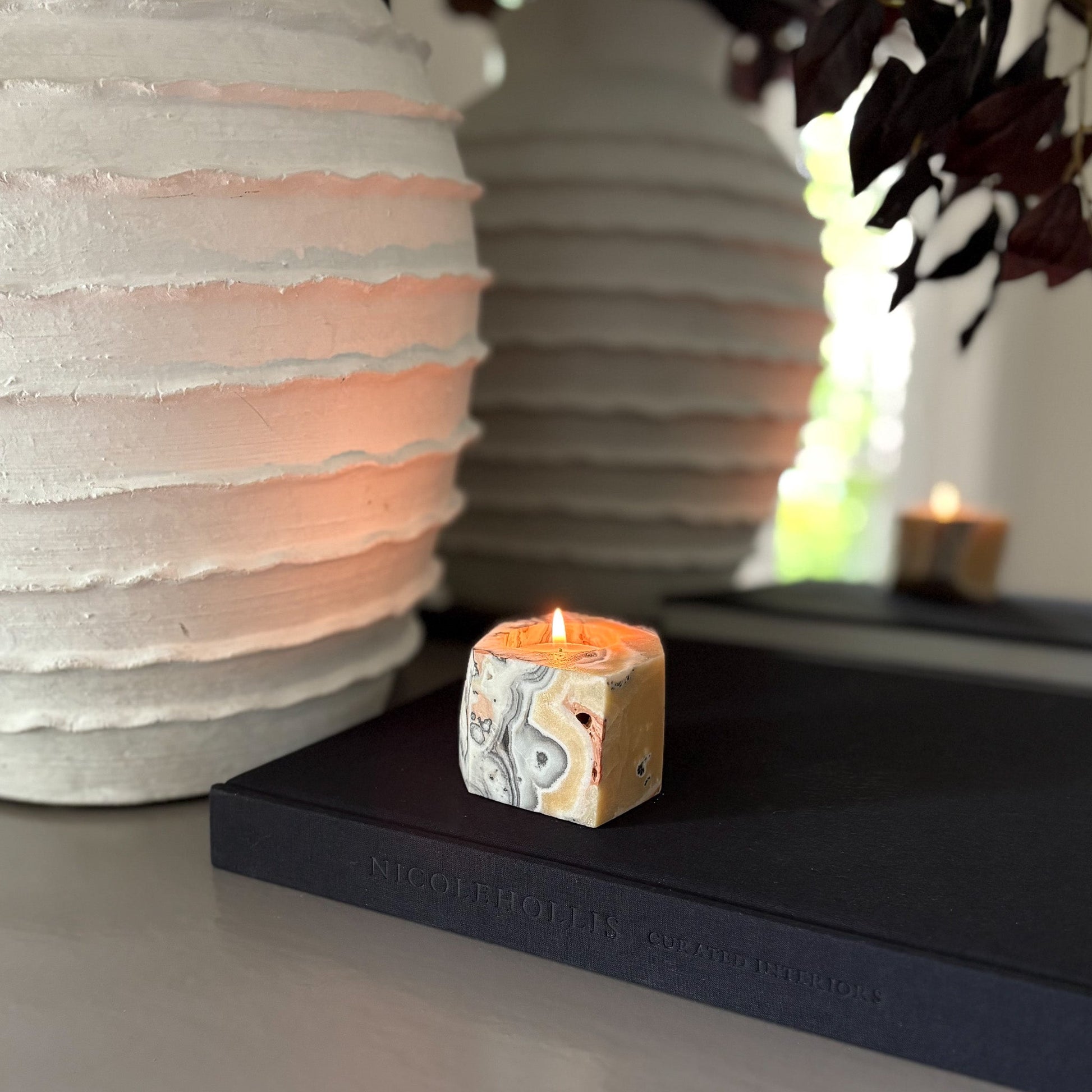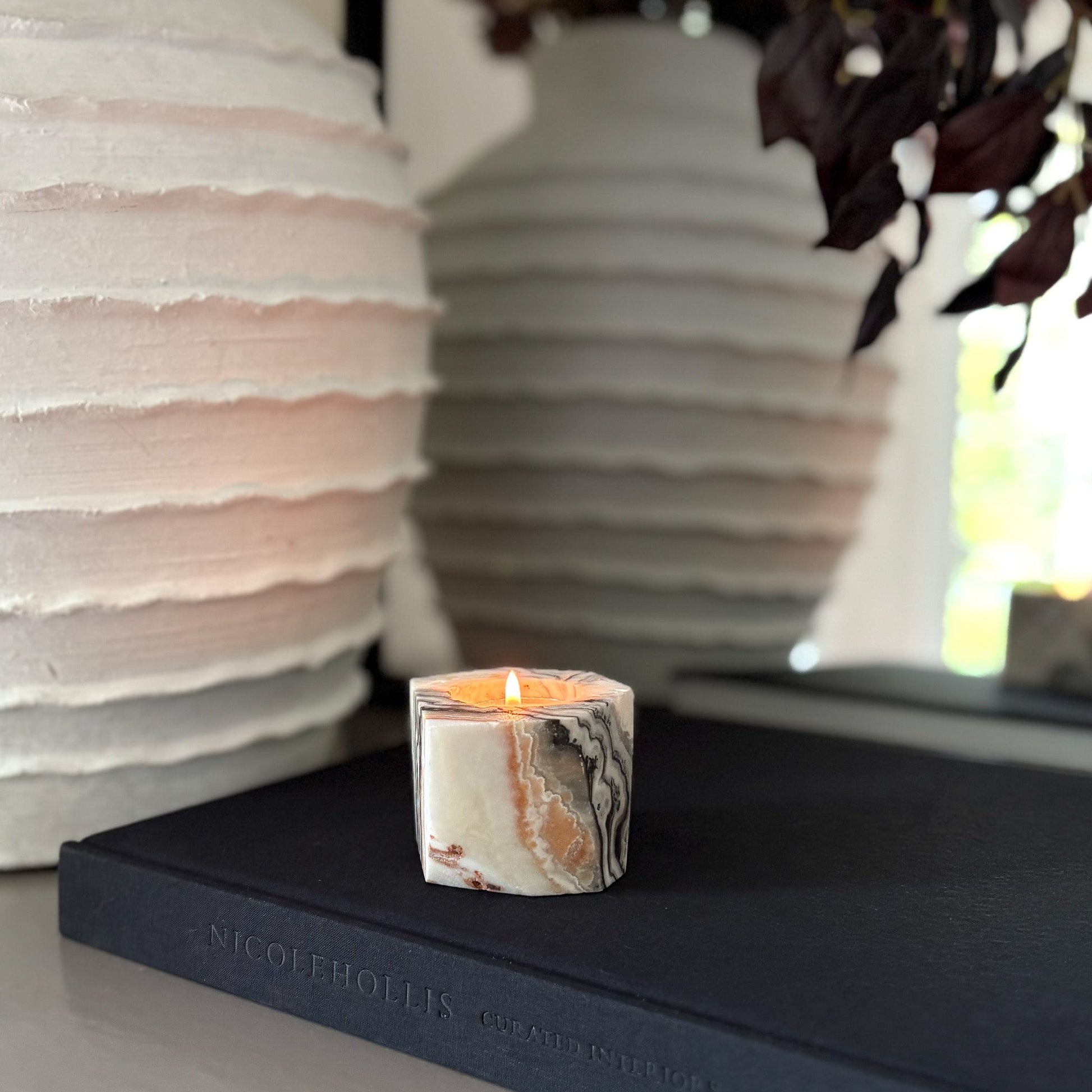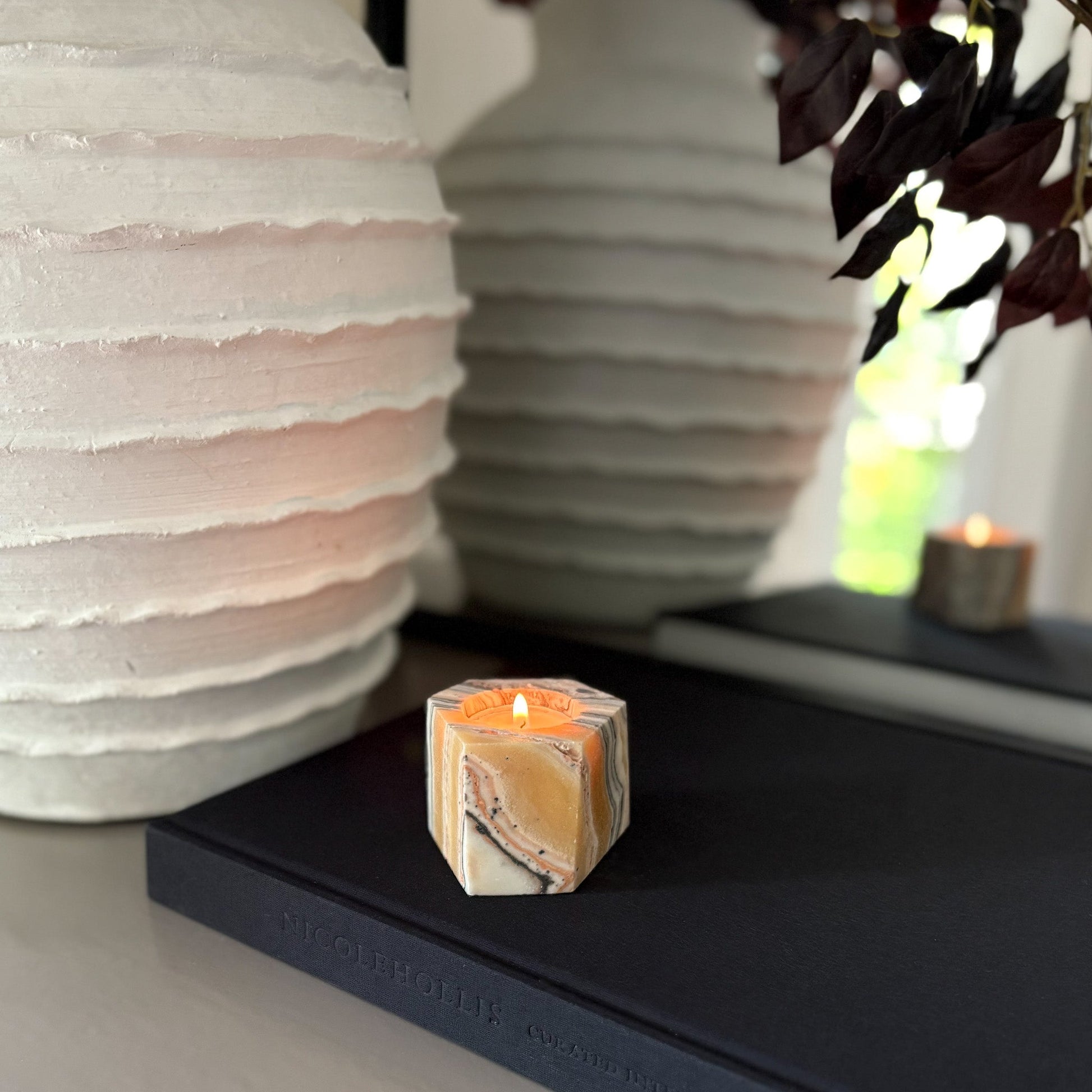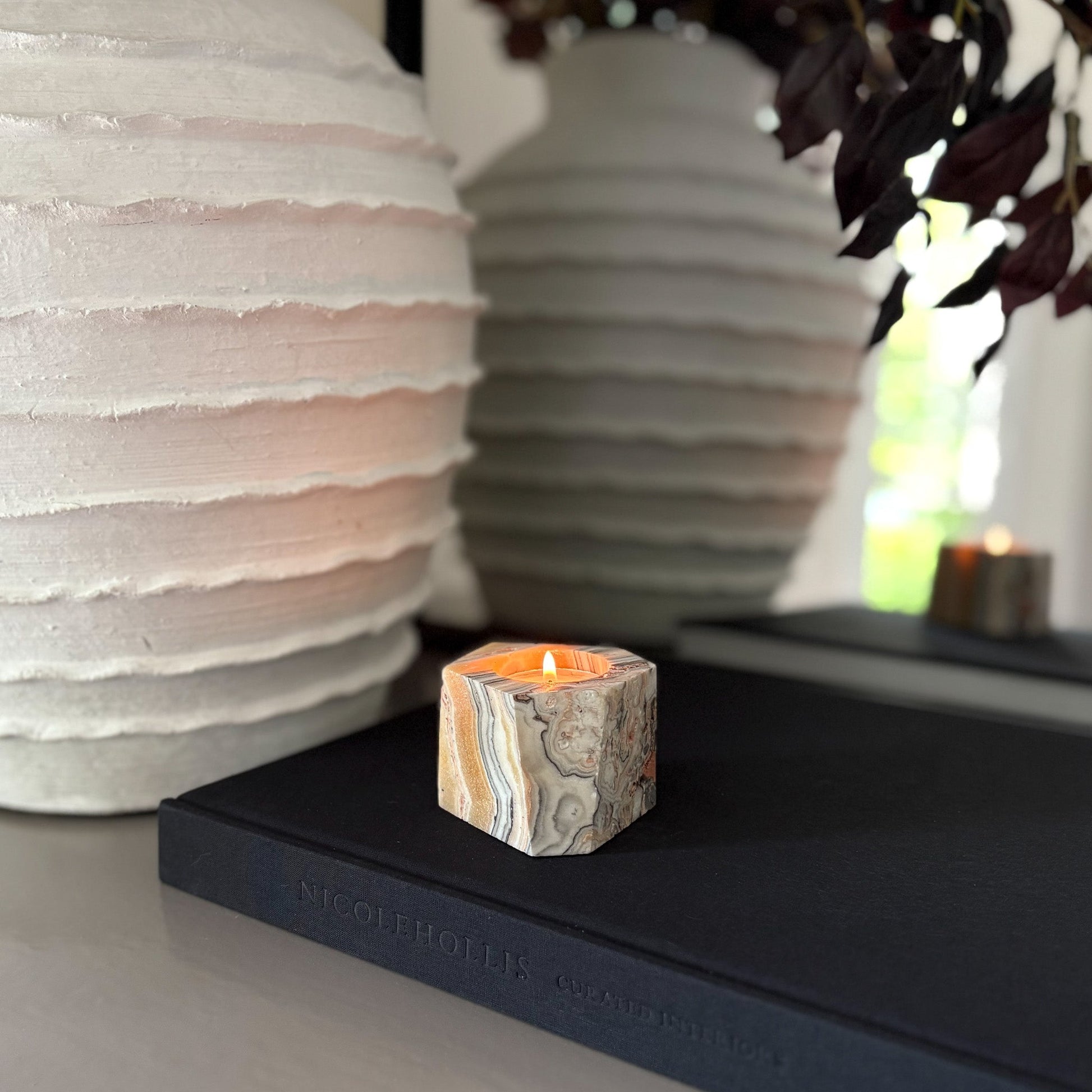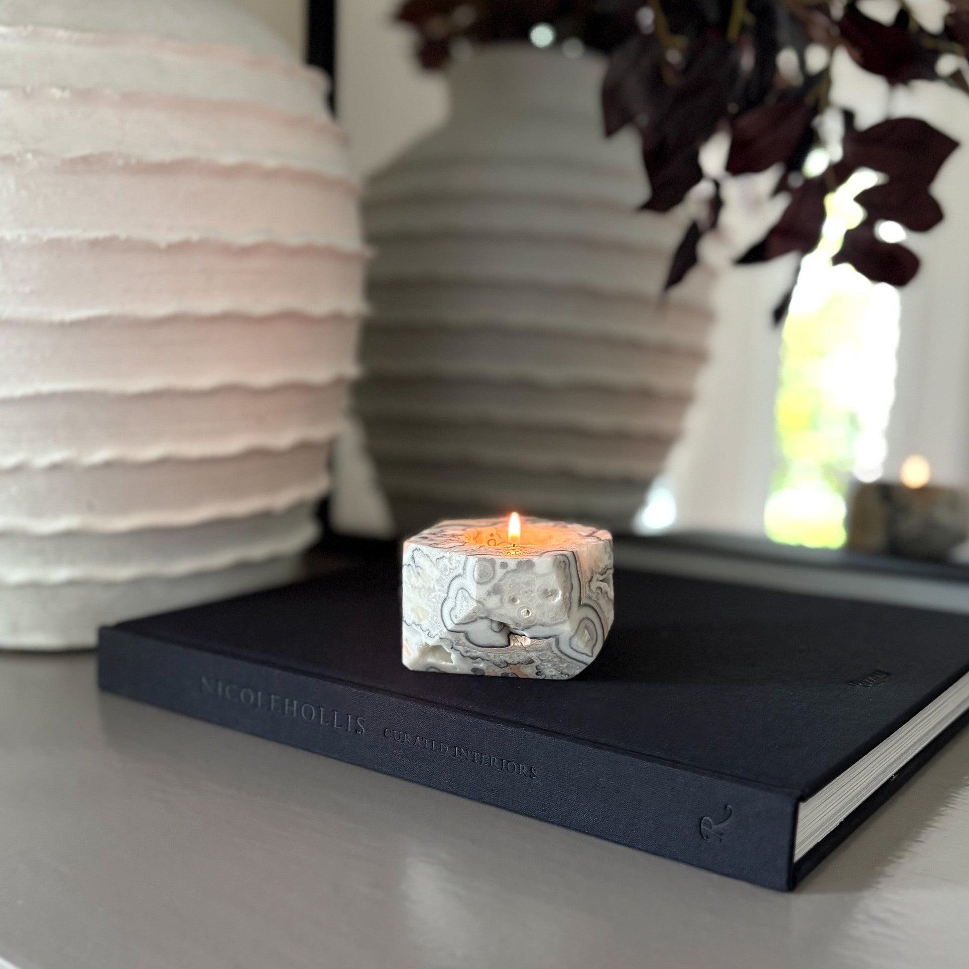 Infuse your home with the grounding beauty of nature. Our Faceted Zebra Calcite Tealight Candle Holder is a striking fusion of natural artistry and ambient light. Carved from genuine Zebra Calcite, each piece features dramatic bands of cream, brown, and grey—each one unique, just like the rock it came from.